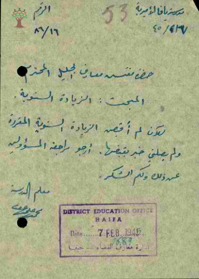رسالة من المعلم محمد علي عودة الى مفتش معارف الجليل بخصوص الزيادة السنوية ولم اقبض الزيادة السنوية ولم يصلني خبر بقبضها