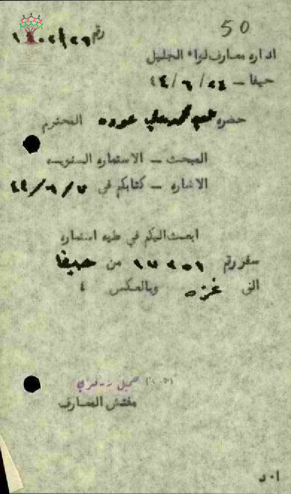 رسالة من مفتش المعارف الى المعلم محمد علي عودة بخصوص الاستمارة السنوية من حيفا اللى غزة وبالعكس