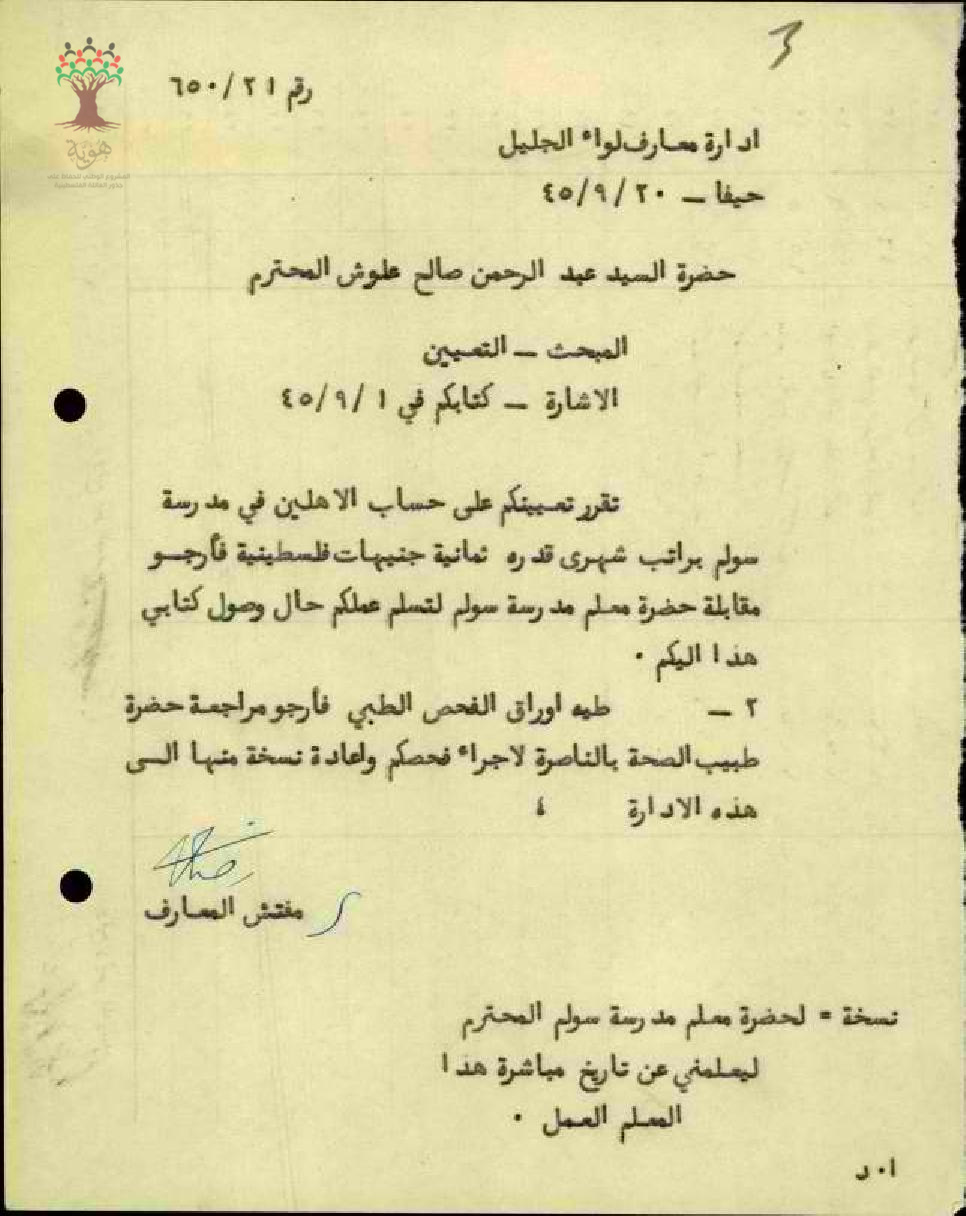 قرار تعيين المعلم عبد الرحمن علوش مدرساً في مدرسة سولم وذلك براتب شهري وقدره ثمانية جنيهات فلسطينية