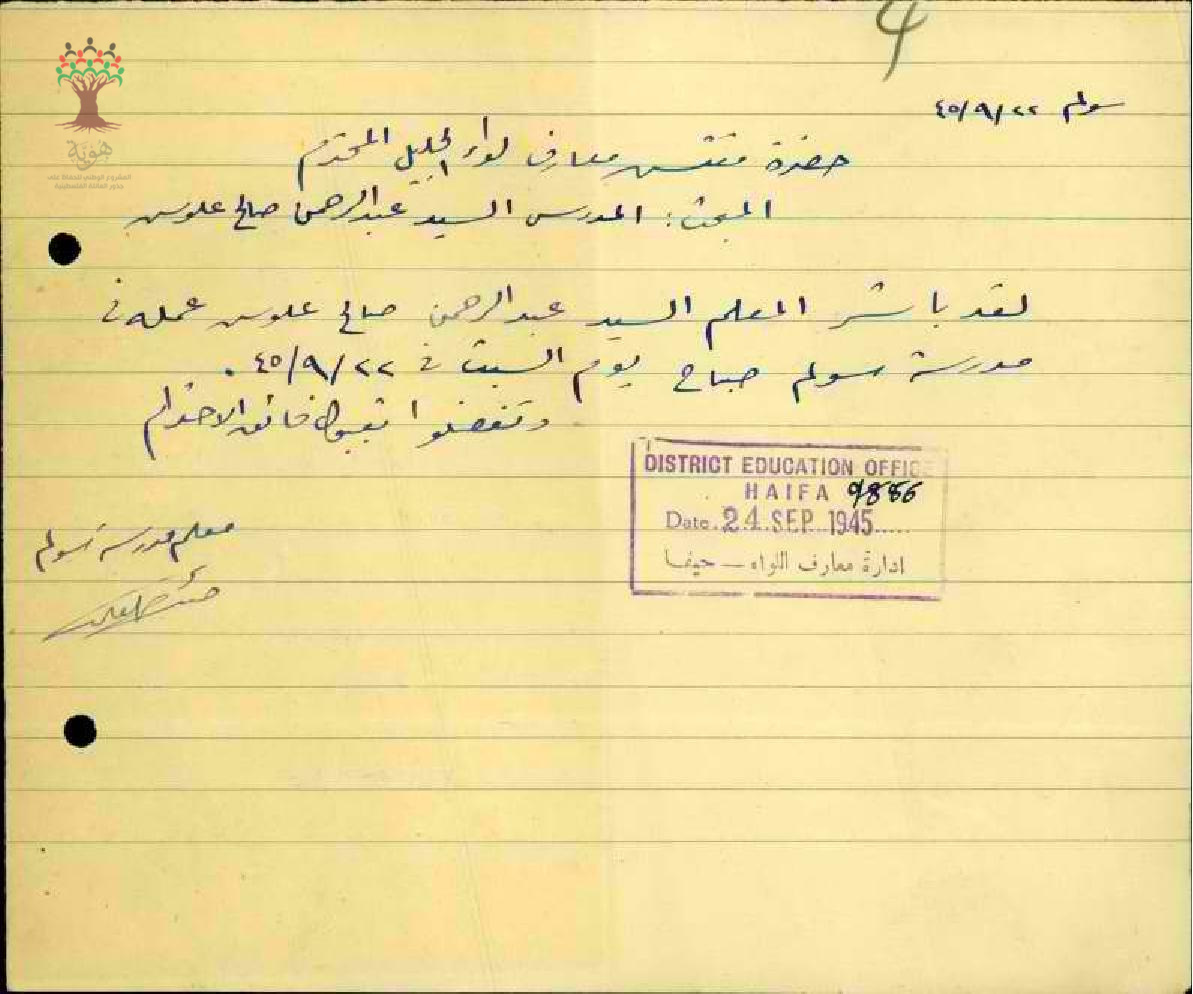 إخبار بمباشرة المعلم عبد الرحمن علوش عمله في مدرسة سولم في صفورية