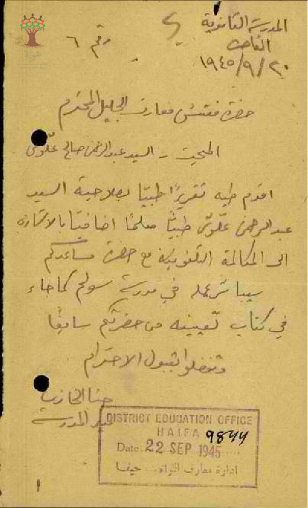 يرسل مدير مدرسة سولم رسالة يخبر فيها مفتش المعارف بارسال تقريراً طبيا خاص بالمعلم عبد الرحمن علوش