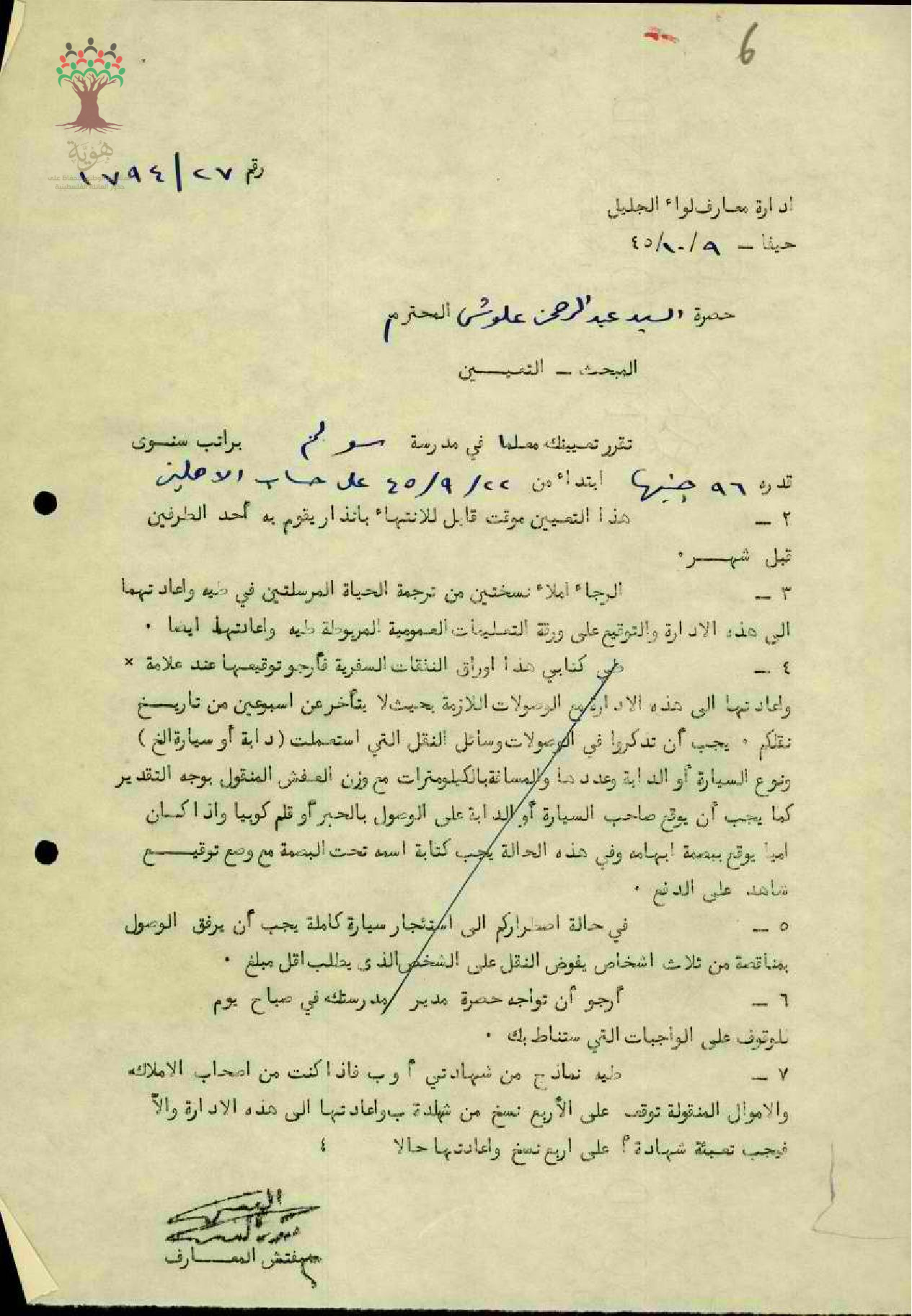 قرار تعيين المعلم عبد الرحمن علوش معلما في مدرسة سولم في صفورية براتب سنوي 96 جنيهاً فلسطينياً