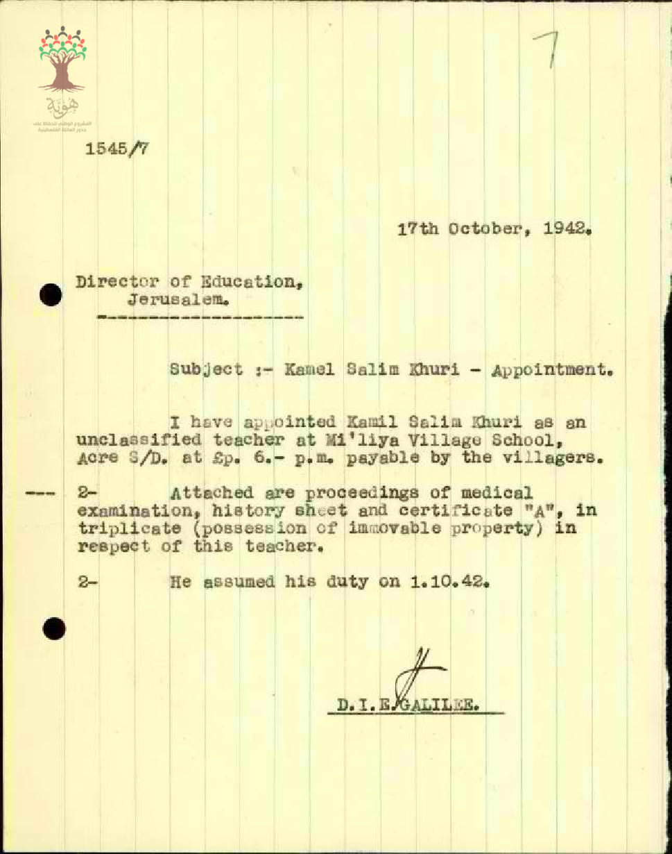 رسالة من مفتش المعارف إلى مدير المعارف يبحث معه أمر تعيين المعلم كامل خوري في الإدارة