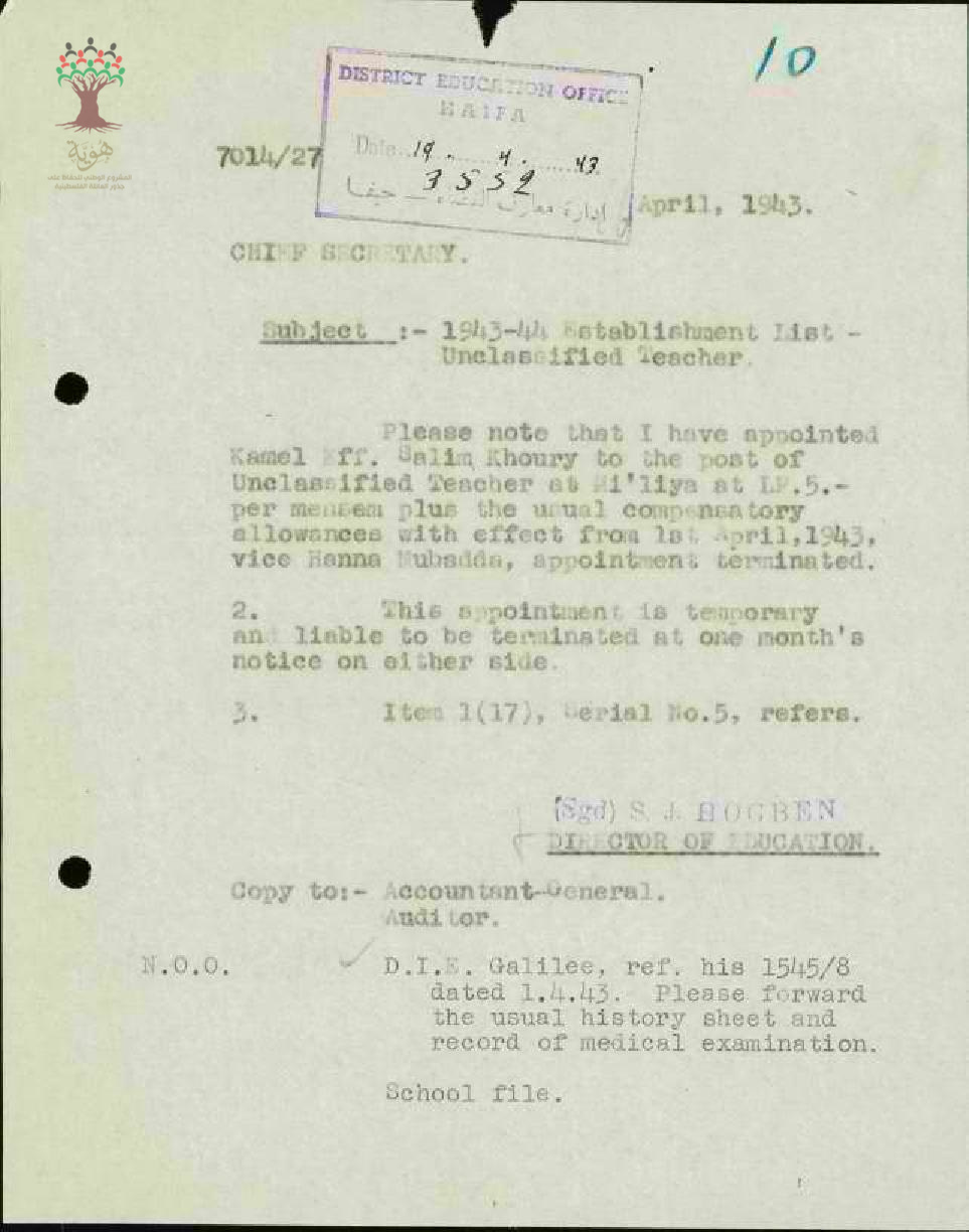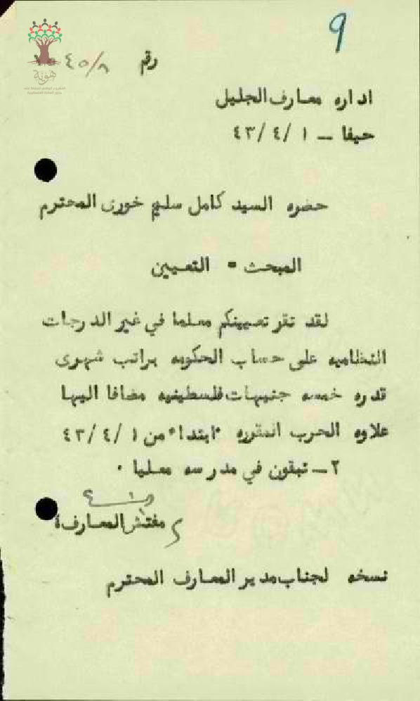 رسالة من مفتش المعارف إلى المعلم كامل خوري يخبره بقرار تعيينه معلماً على حساب الحكومة في مدرسة معليا
