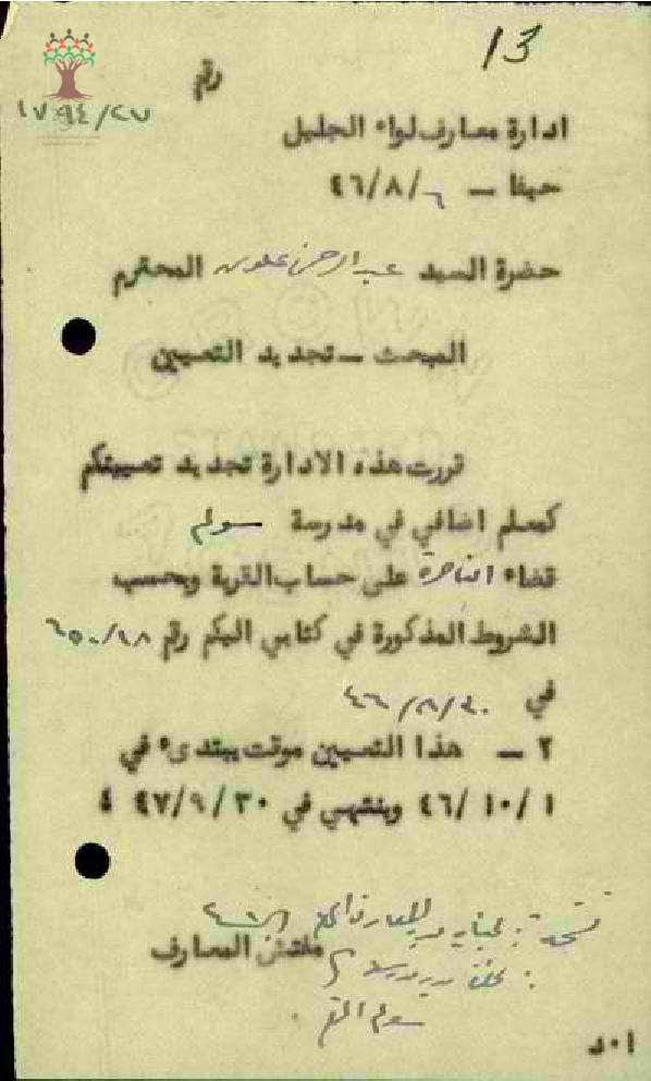 قرار اعادة تعيين المعلم عبد الرحمن علوش في مدرسة سولم على ان تدفع جلنة المعارف المحلية راتبه