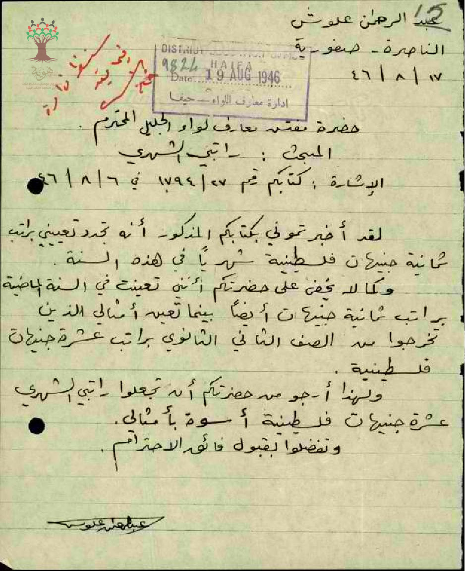 طلب زيادة راتب مقدم من المعلم عبد الرحمن علوش على ان يصبح راتبه الشهري 10 جنيهات بدل 8 جنيهات