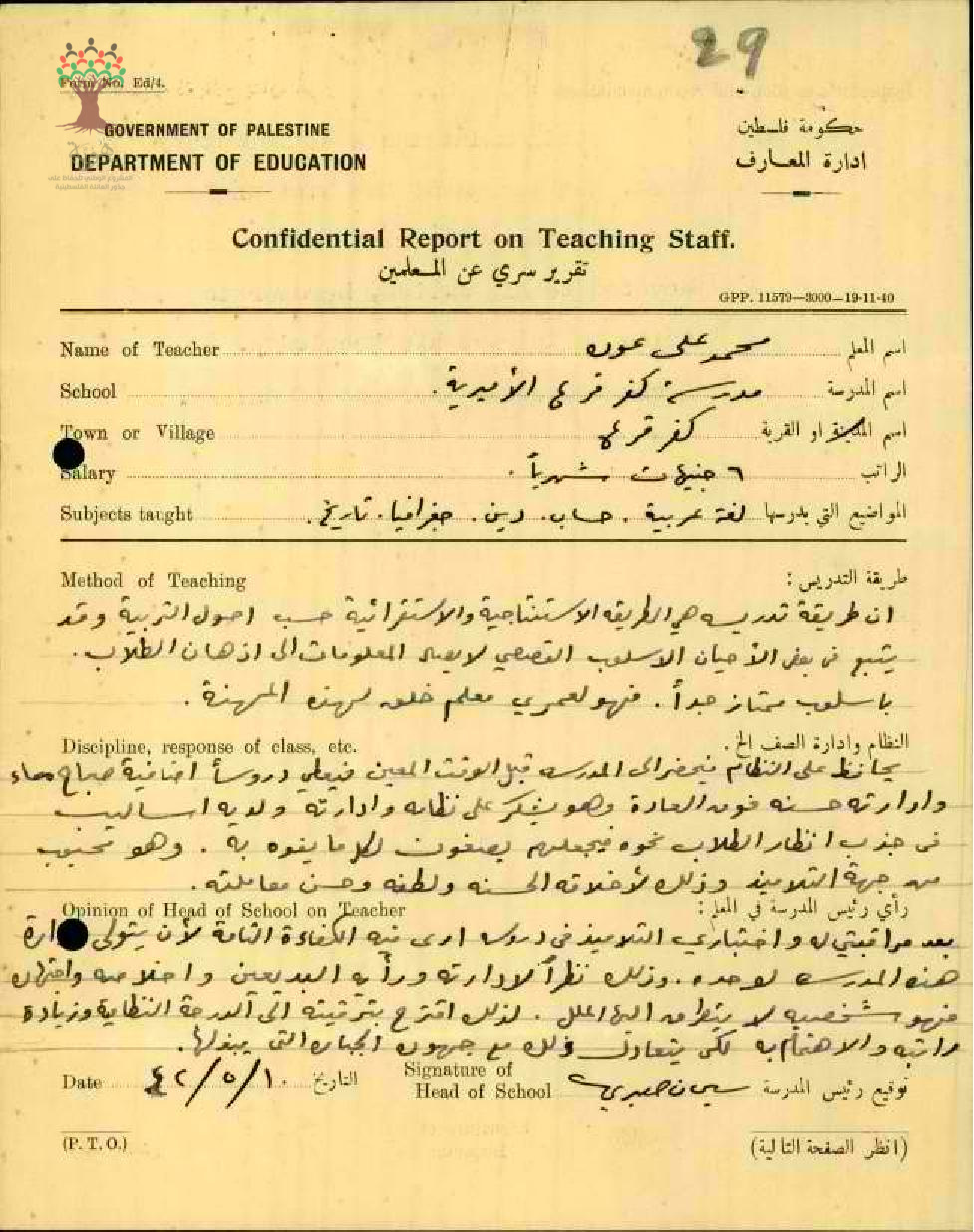 تقرير سري عن المعلم محمد علي عودة في مدرسة كفر فرعم الاميرية وان طريقة تدريسه هي الطريقة الاستنتاجية والاستقرائية حسب اصول التربية