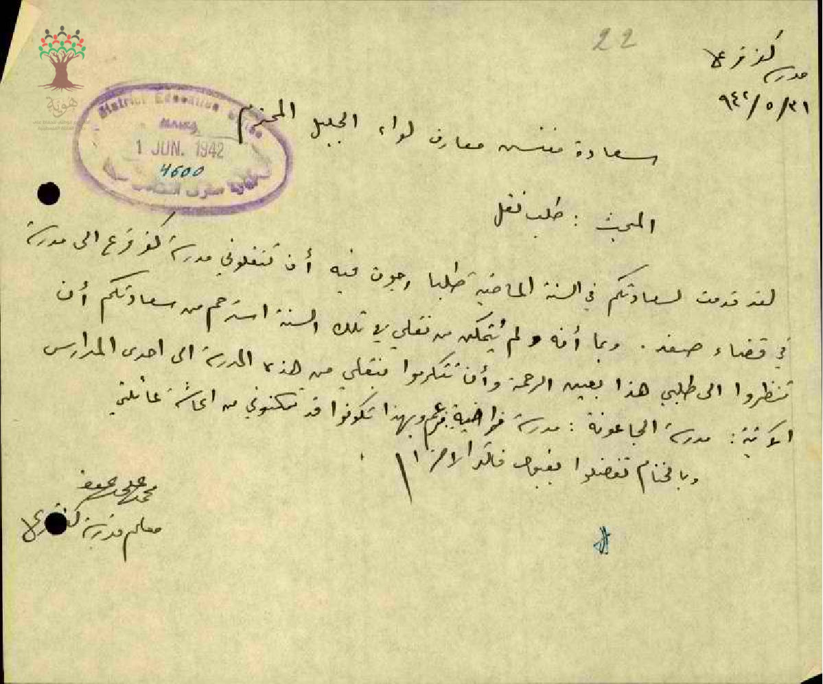 رسالة من المعلم محمد علي عودة الى مفتش معارف الجليل لقد قدمت لسعادتكم في السنة الماضية طلب ارجو فيه ان تقبلوني مدرس في مدرسة كفر فرعم الى مدرس في قضاء صفد
