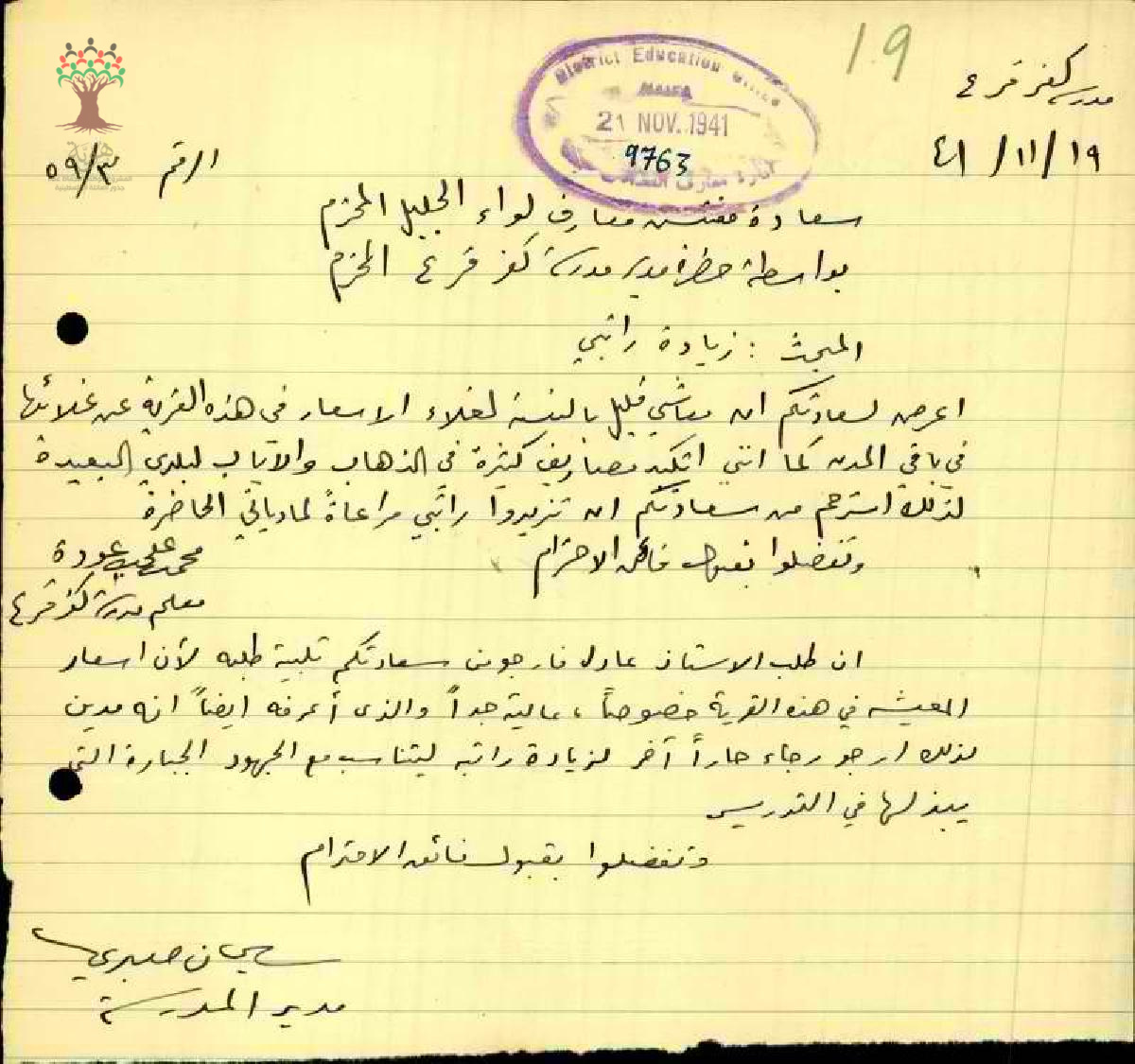 رسالة من المعلم محمد علي عودة الى مفتش معارف الجليل اعرض لساعدتكم ان معاشي قليل بالنسبة لغلاء الاسعار في هذه القرية عن غلائها في باقي المدن