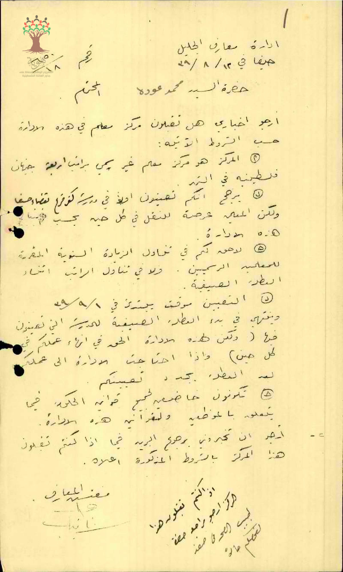 رسالة من مفتش المعارف الى المعلم محمد عل عودة ارجو اخباري هل تقبلون مركز معلم في هذه الادارة حسب الشروط