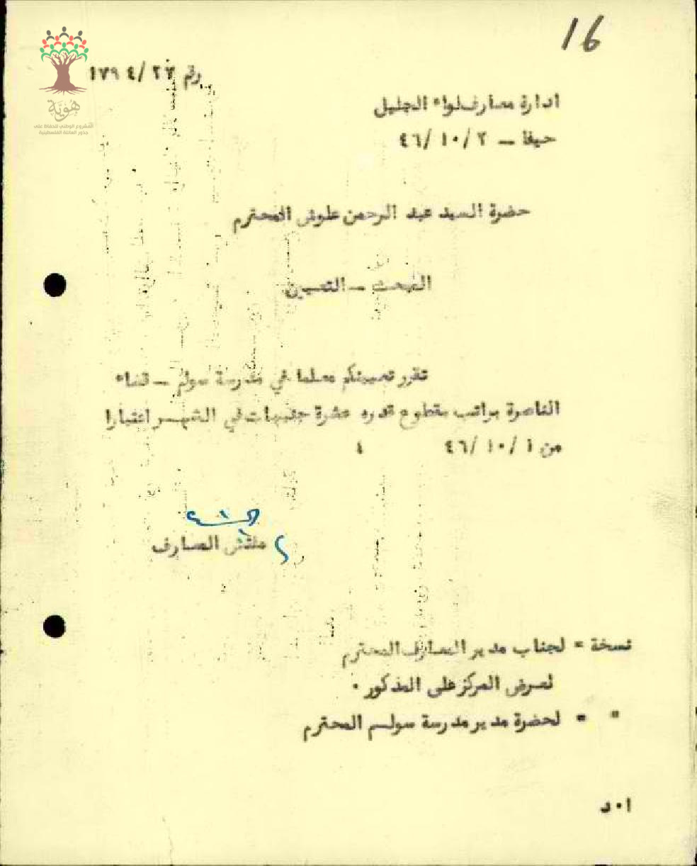 قرار تعيين المعلم عبد الرحمن علوش مدرساً في مدرسة سولم