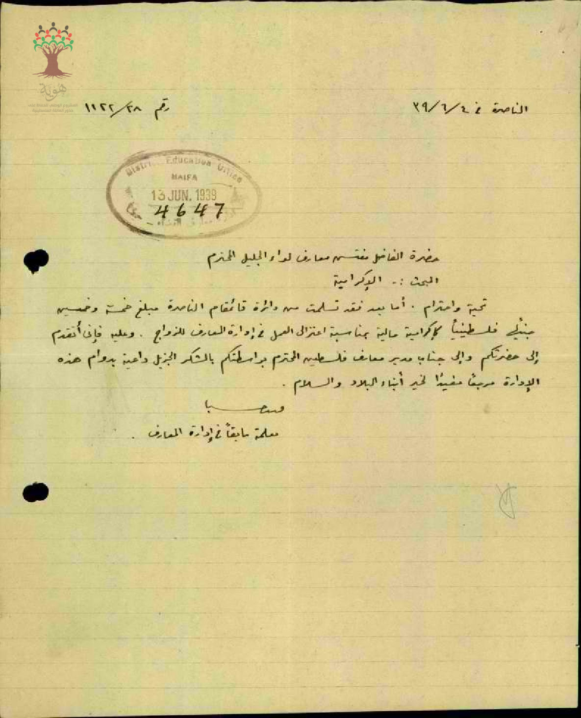 رسالة من المعلمة وردة سابا الى مفتش معارف الجليل بخصوص الاكرامية اما بعد فقد استلمت من دائرة قائمام الناصرة خمسة وخمسين جينها فلسطينيا