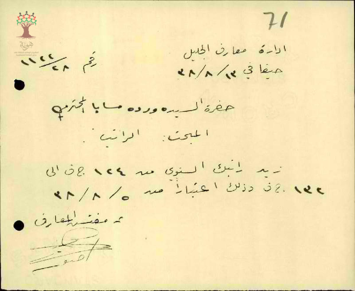 رسالة من مفتش المعارف الى المعلمة وردة بخصوص زيادة راتبك السنوي