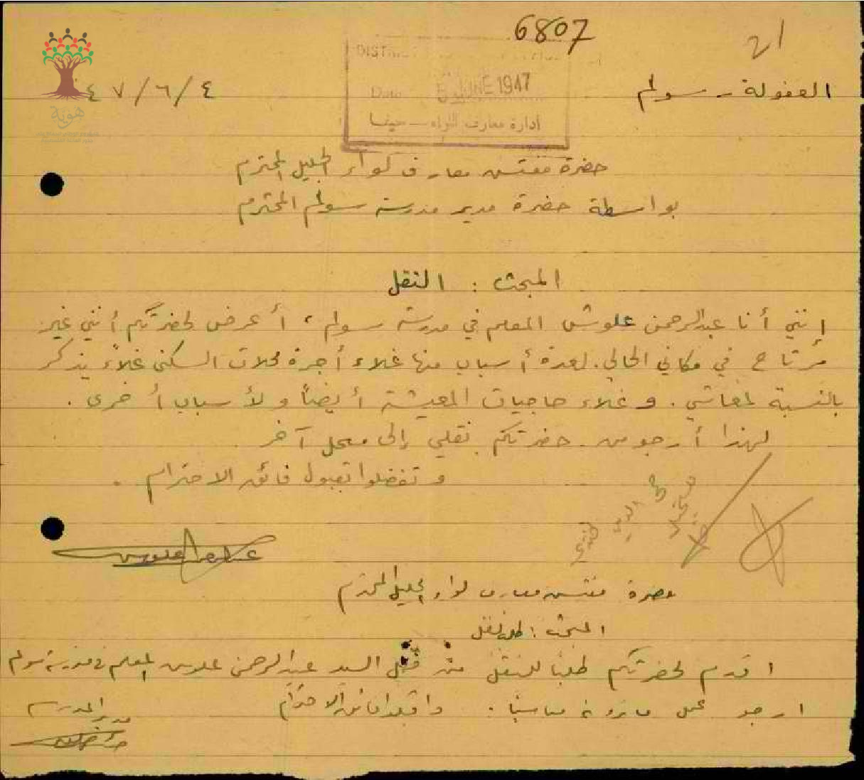 طلب نقل مقدم من المعلم عبد الرحمن علوش من مدسرة سولم سبب غلاء المعيشة والسكن في المنطقة التي يسكن فيها