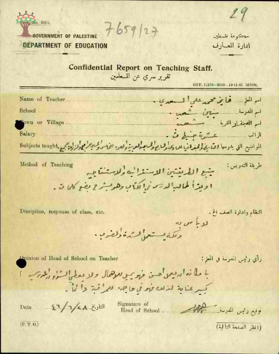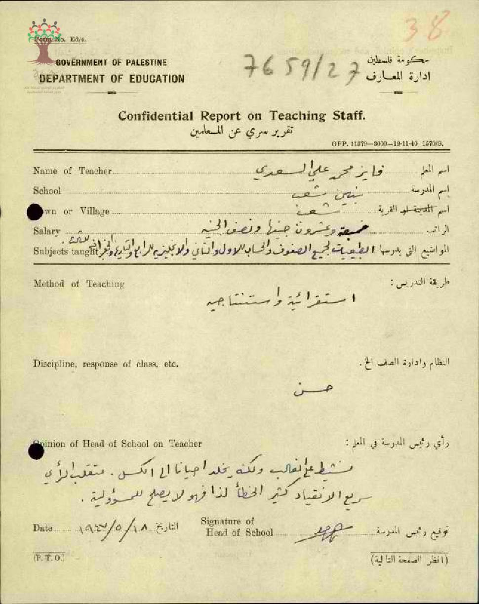 تقرير تفصيلي حول اداء المعلم فايز محمد السعدي من مدرسة شعب، يذكر مدير المدرسة رأيه في المعلم بانه نشيط ولكنه يميل الى الكسل احيانا ما يعرضه للوقوع في الخطأ