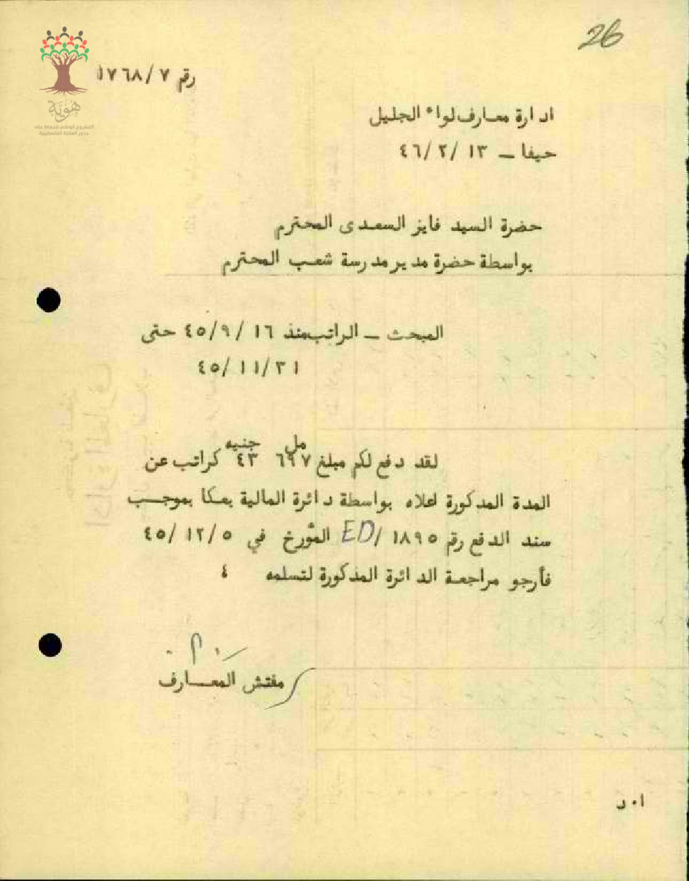 تبليغ المعلم فايز محمد السعدي بدفع راتبه ومراجعة الدائرة المالية لإستلامه
