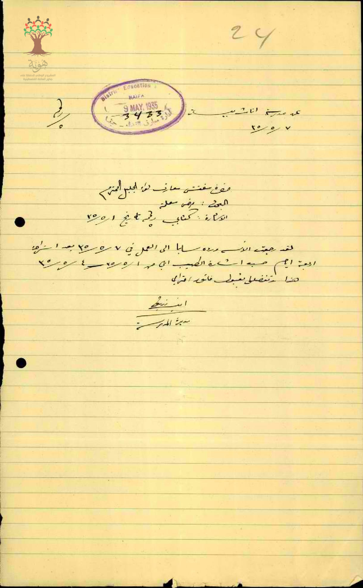 رسالة من مديرة المدرسة الى مفتش معارف الجليل بخصوص عودة المعلمة وردة سابا الى المدرسة