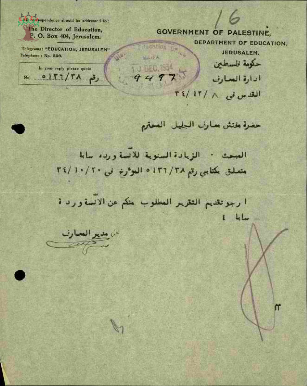 رسالة من مدير المعارف الى مفتش معارف الجليل بخصوص الزيادة السنوية الى المعلمة وردة سابا