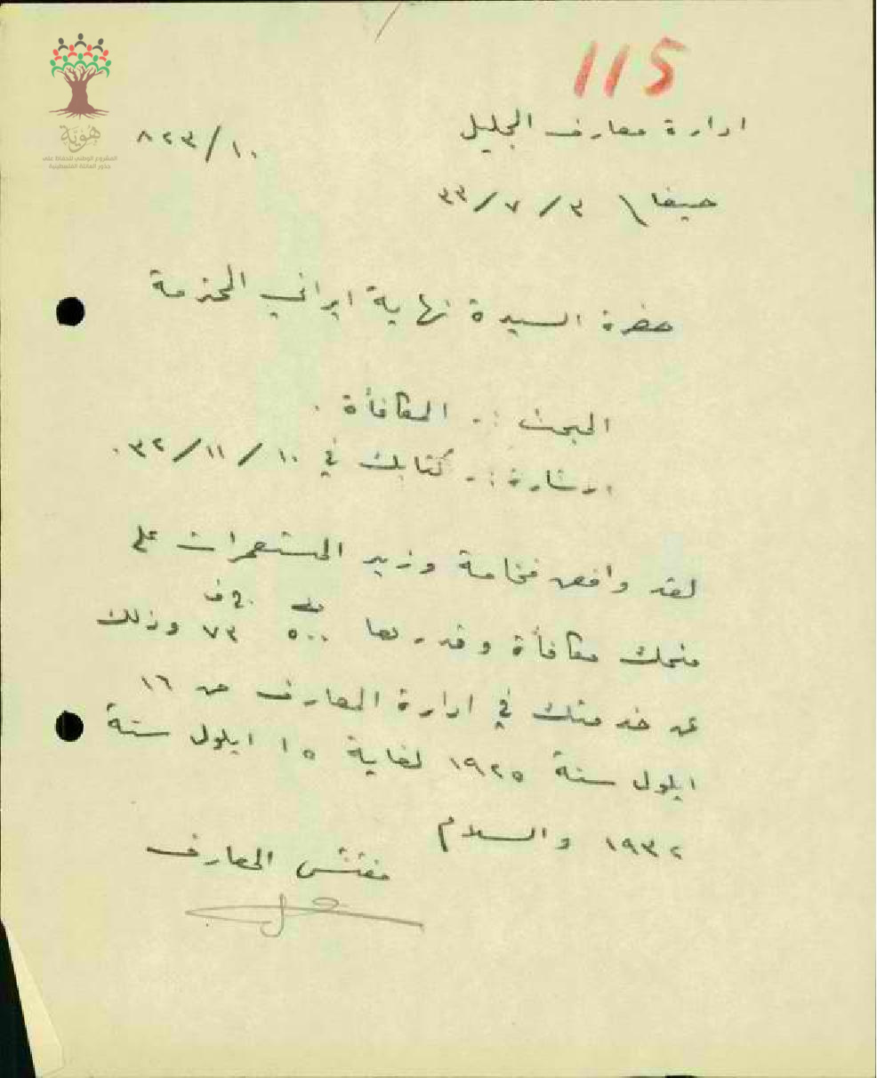 رسالة من مفتش المعارف الى المعلمة نهايات ايراني لقد وافقة فخامة وزير المستعمرات على منحك مكافئة
