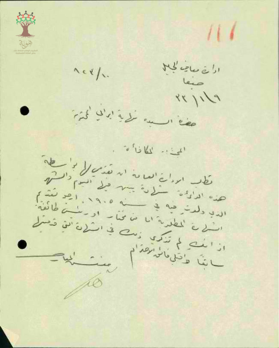 رسالة من مفتش المعارف الى المعلمة نهايات ايراني بخصوص طلب الادارة العامة ان تقدمي لها بواسطة هذة الدائرة شهادة يبين فيها اليوم والشهر الذي ولدتي فيه