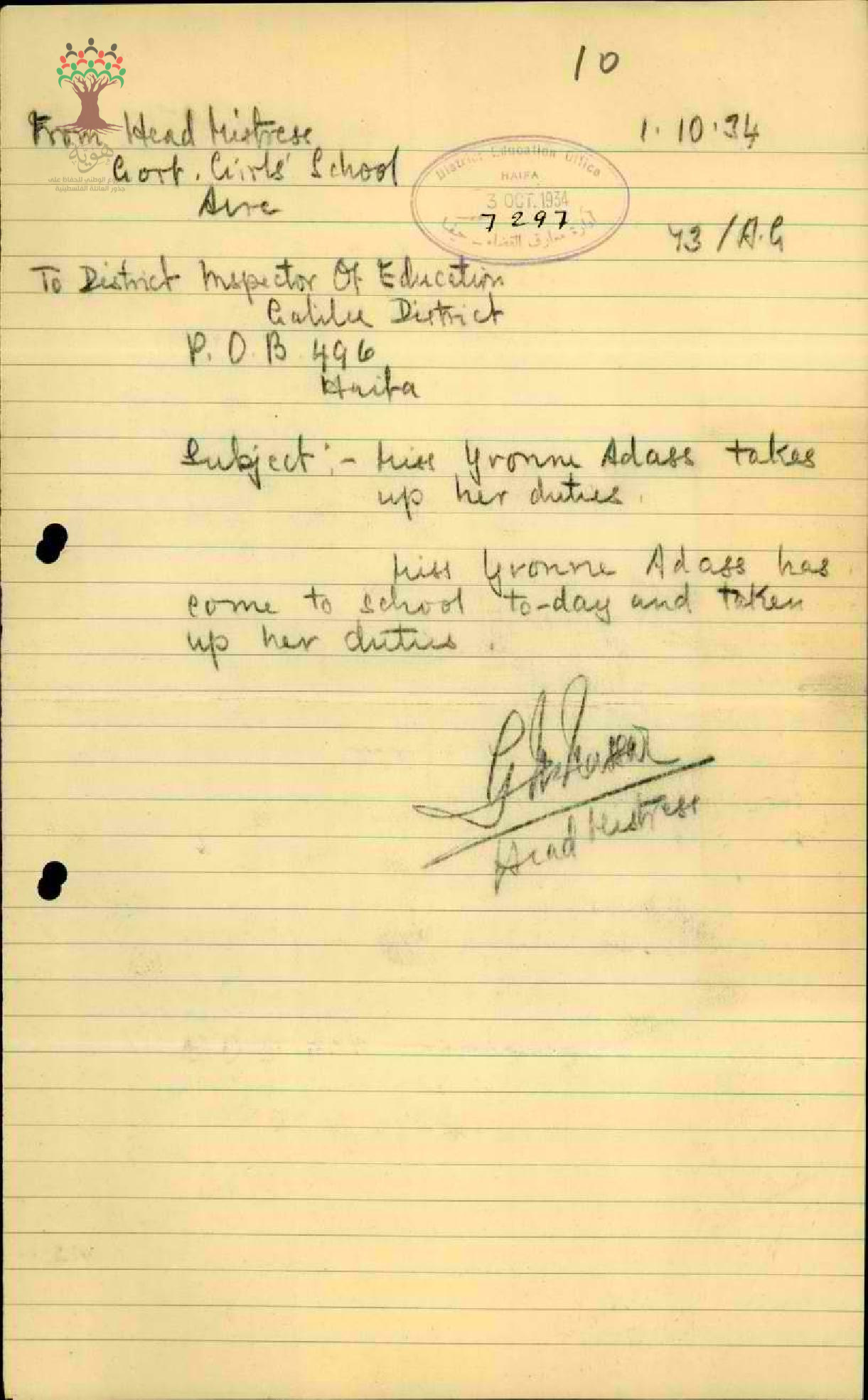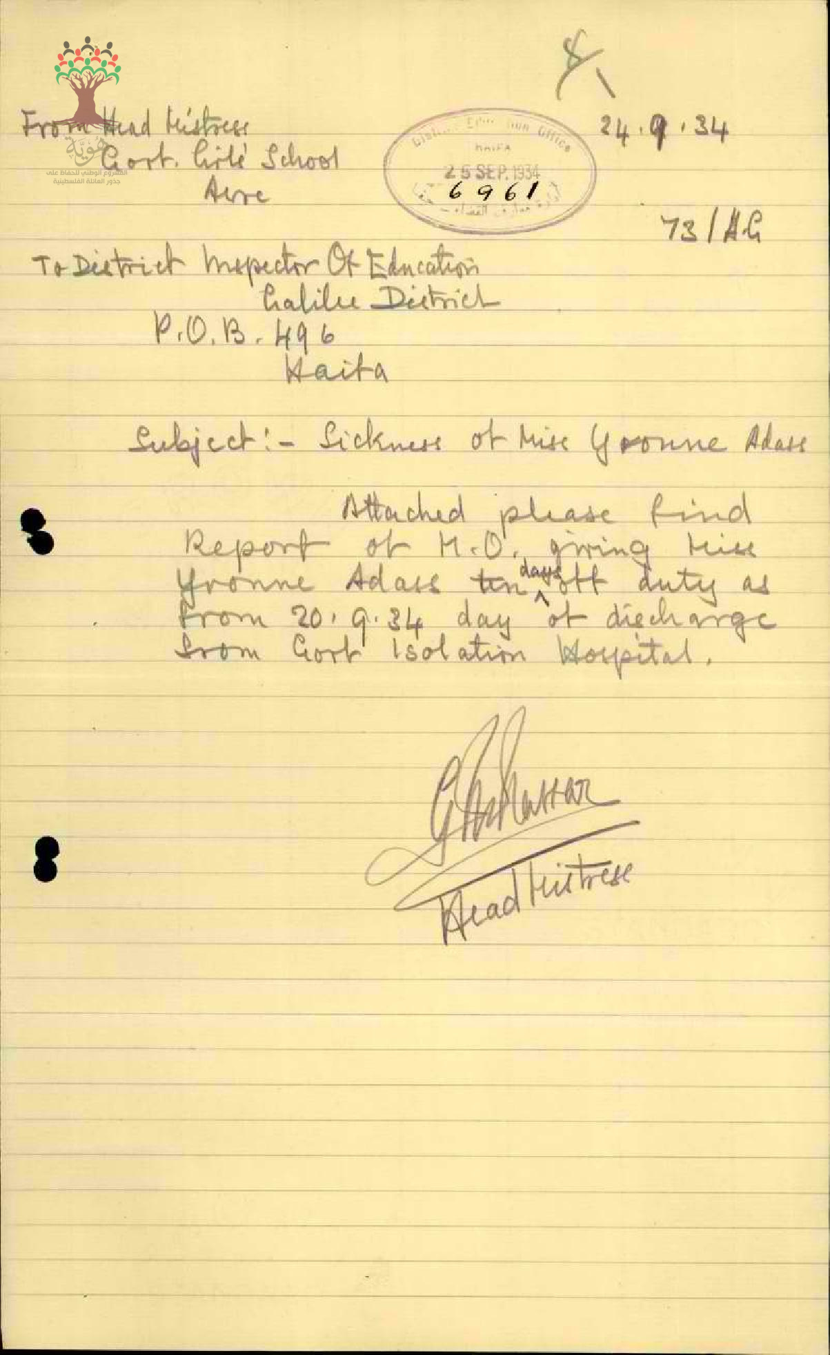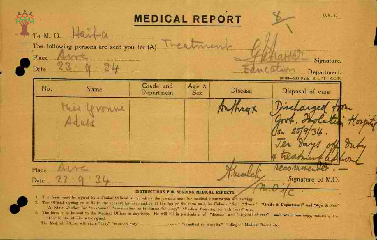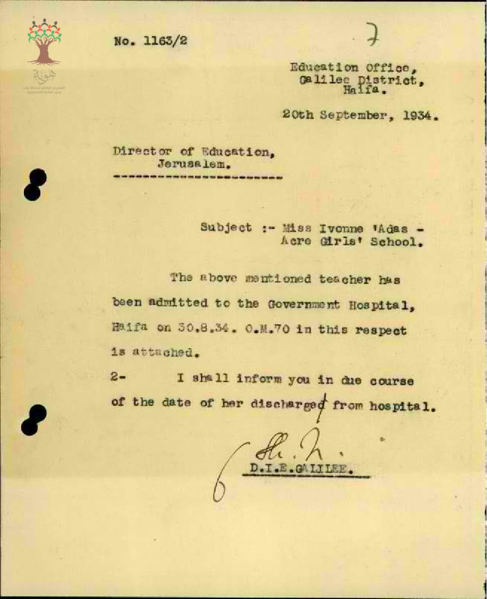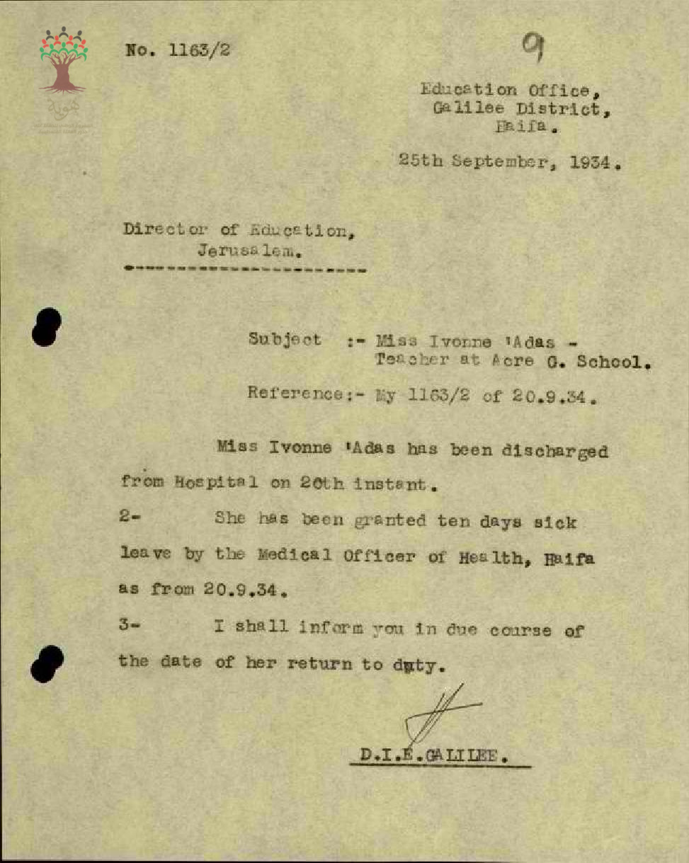 رسالة من مفتش المعارف إلى مدير المعارف يبحث معه غياب المعلمة ايفون عدس بسبب المرض مرفقاً التقرير الطبي