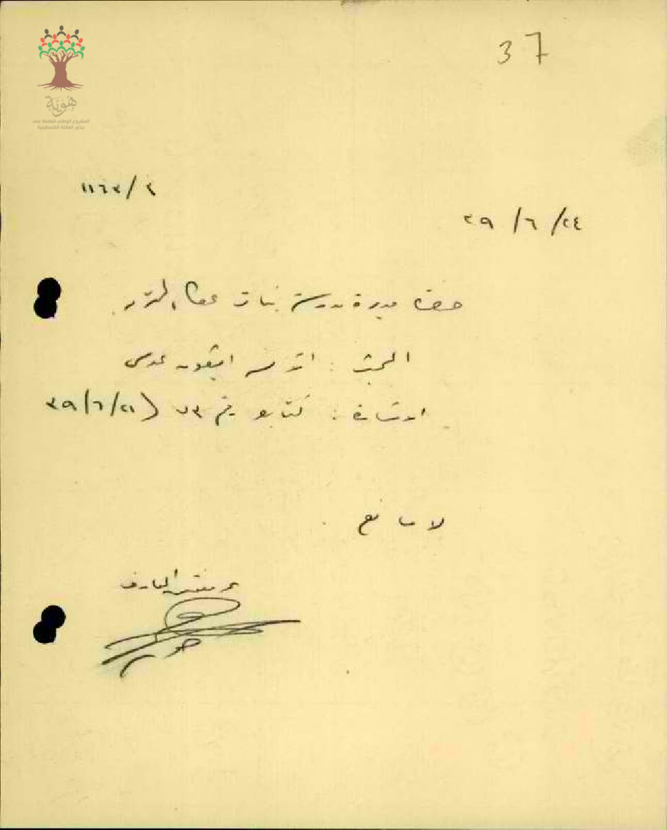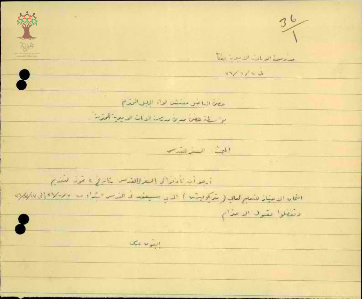 رسالة من المعلمة ايفون عدس إلى مفتش المعارف تطلب السماح لها بالسفر إلى القدس لتقدم امتحان الاجتياز للتعليم العالي