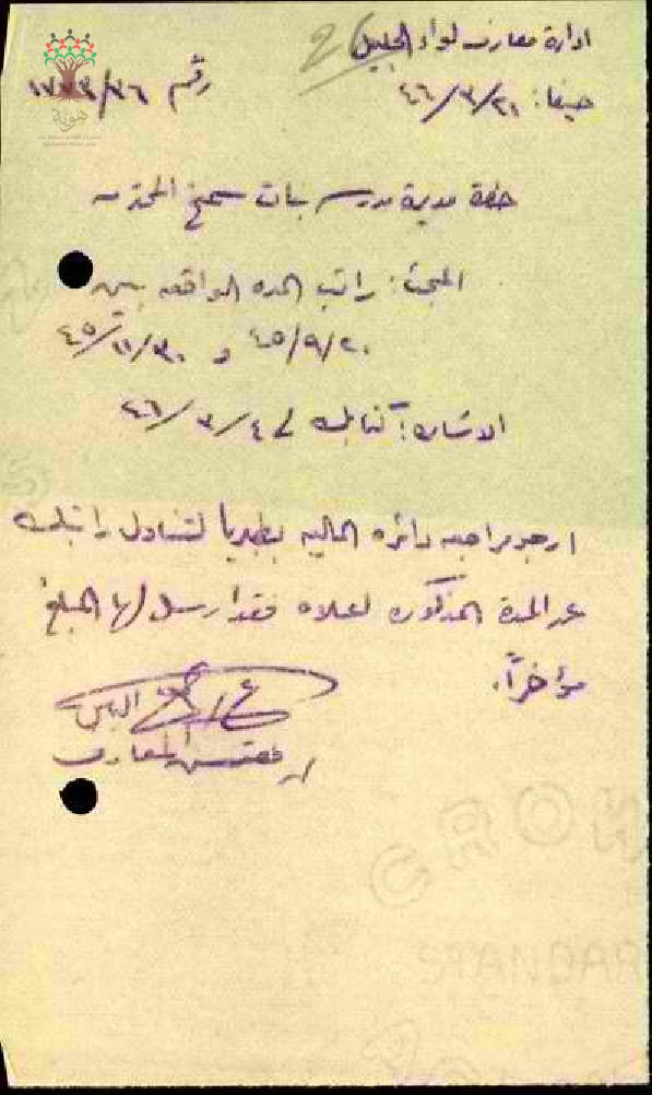 رسالة من مفتش المعارف الى المعلمة مريم مصطفى خميس ارجو مراجعت دائرة المالية بطبريا لتناول راتبك عند المدة المذكورة اعلاه