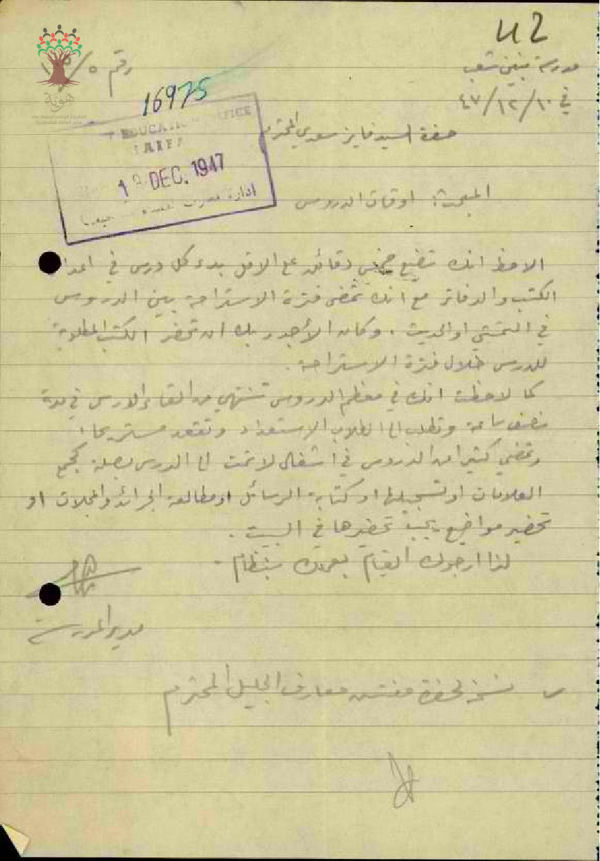 ملاحظات حول اداء المعلم فايز محمد السعدي من مدسة شعب موجه من مدير المدرسة