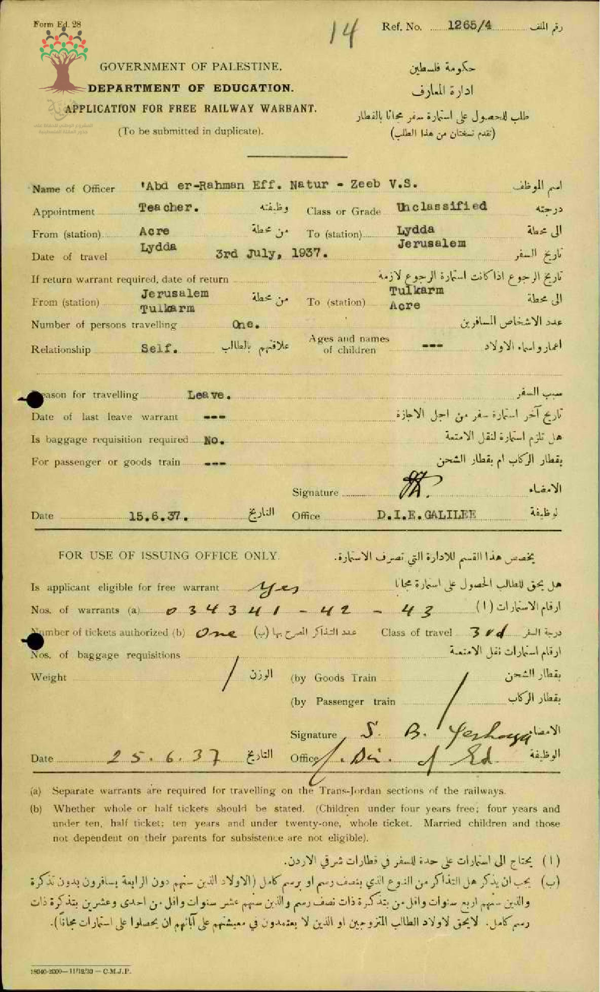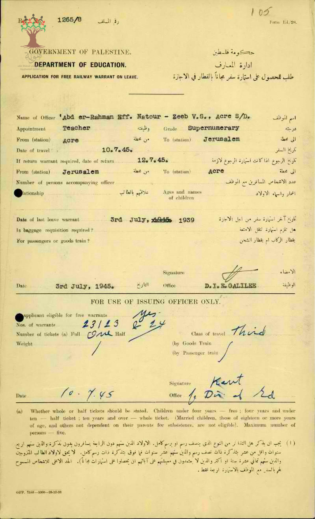 طلب الحصول على استمارة سفر مجانية بالقطار مقدمة من المعلم عبد الرحمن فرج الناطور من مدرسة زيب