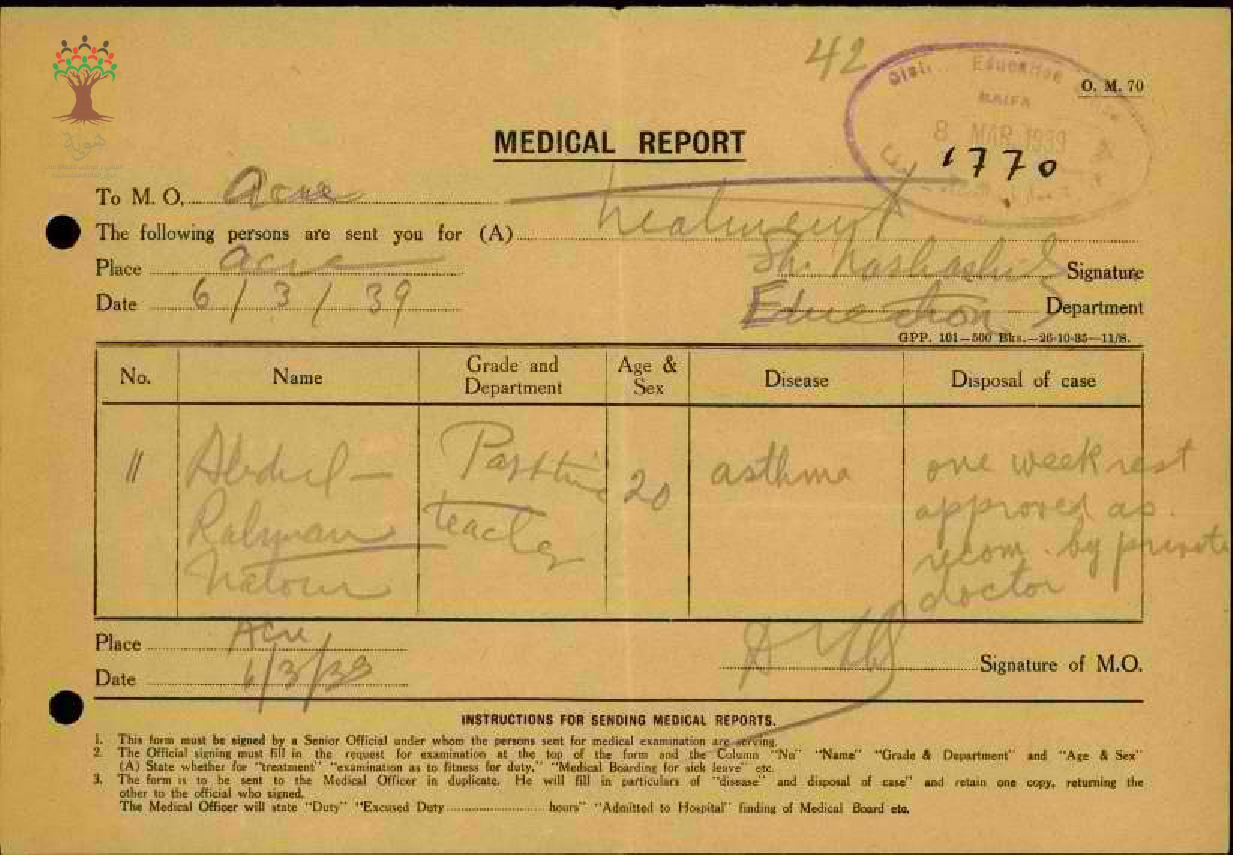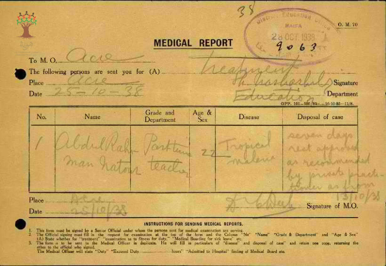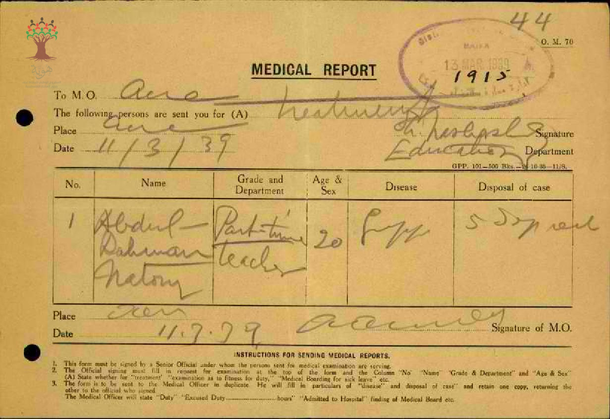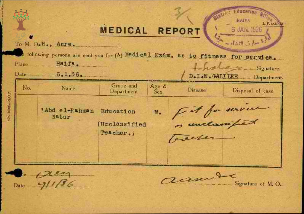 تقرير طبي عند غياب المعلم عبد الرحمن فرج الناطور من مدرسة الزيب