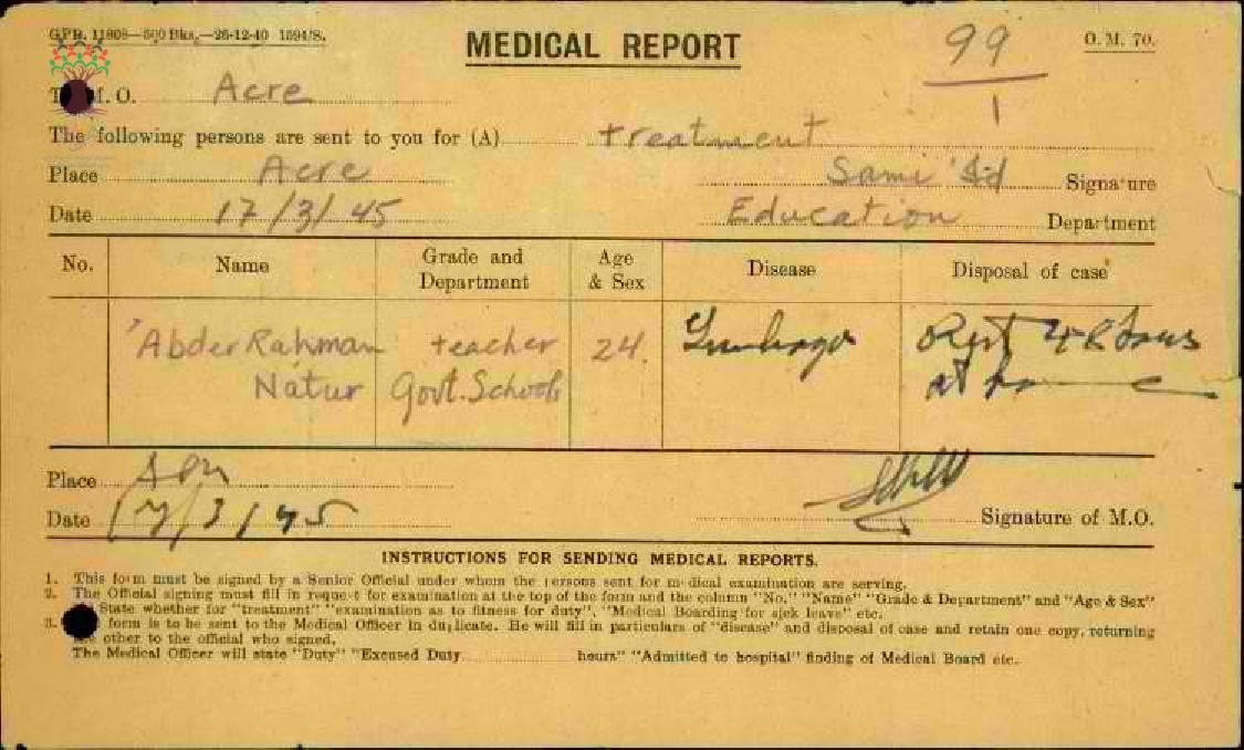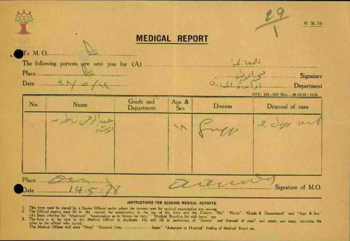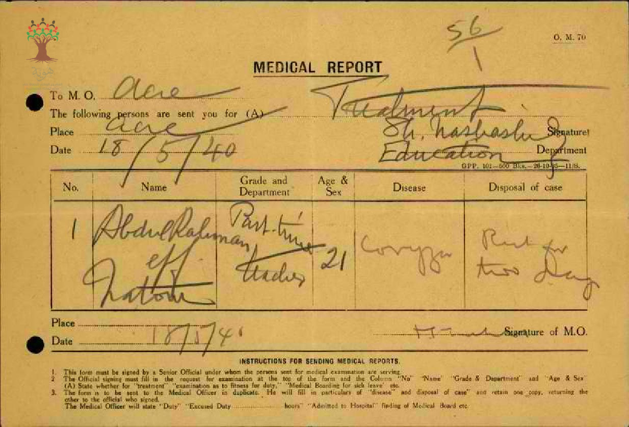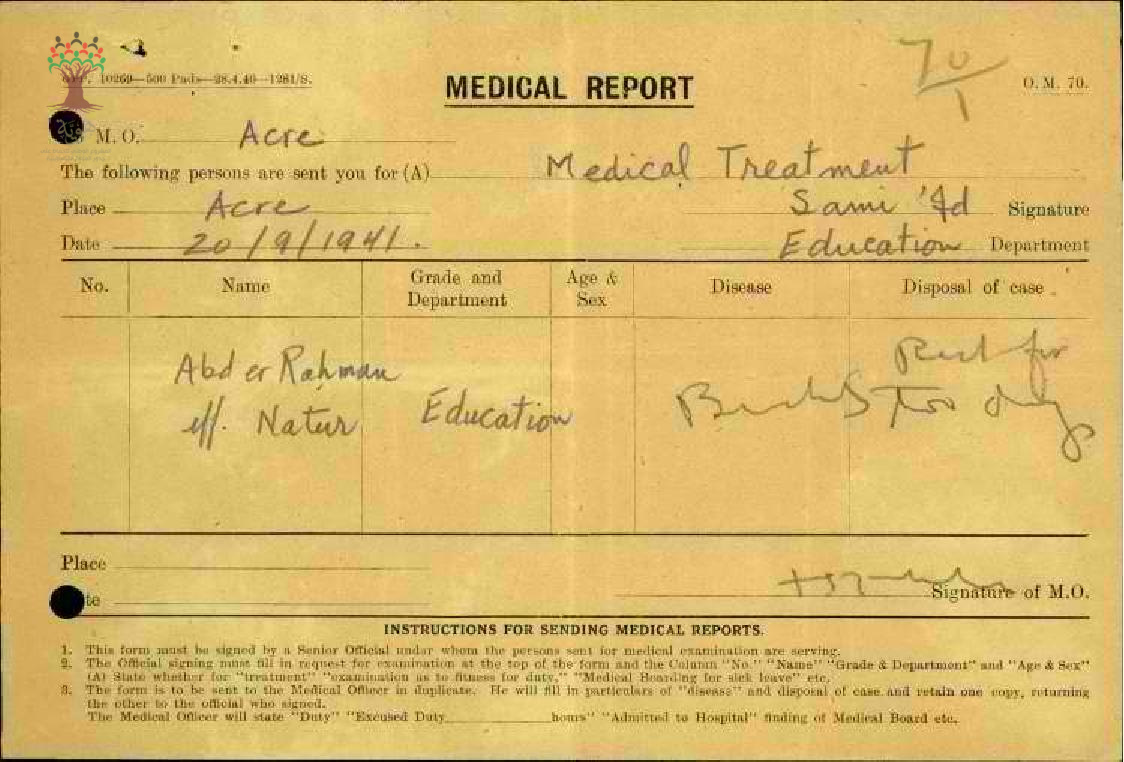 تقرير طبي عند غياب المعلم عبد الرحمن فرج الناطور من مدرسة الزيب