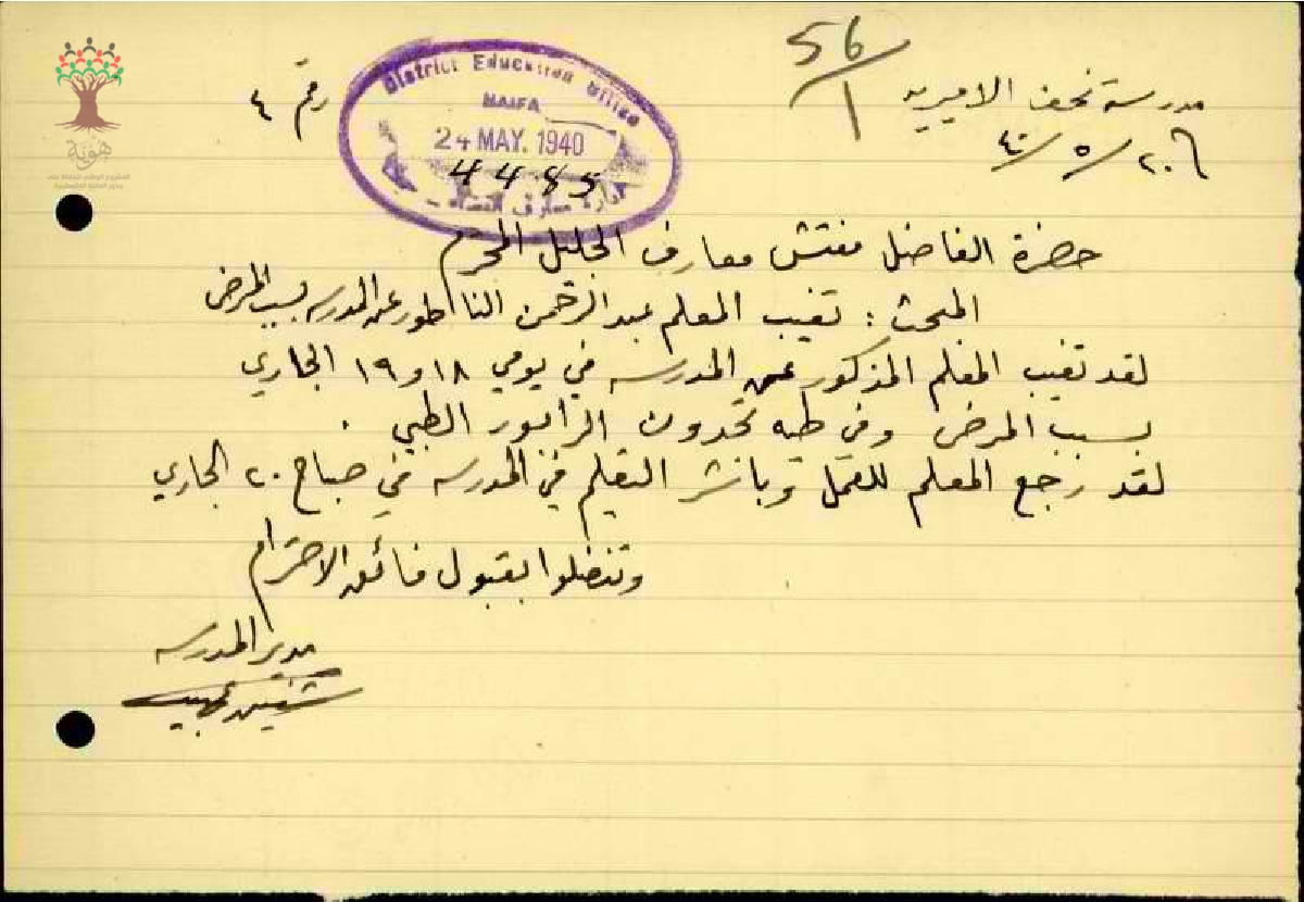 تقرير عن غياب المعلم عبد الرحمن فرج الناطور ليومين عن المدرسة وذلك بسبب المرض وقد ارفقت الرسالة بتقرير طبي