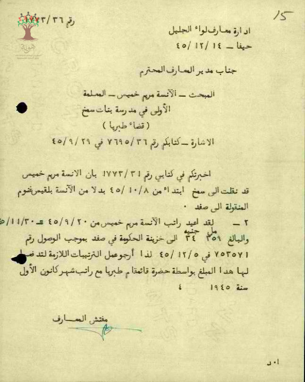 رسالة من مفتش المعارف الى جناب مدير المعارف لقد اعيد راتب المعلمة مريم مصطفى خميس الى خزنية الحكومة في صفد