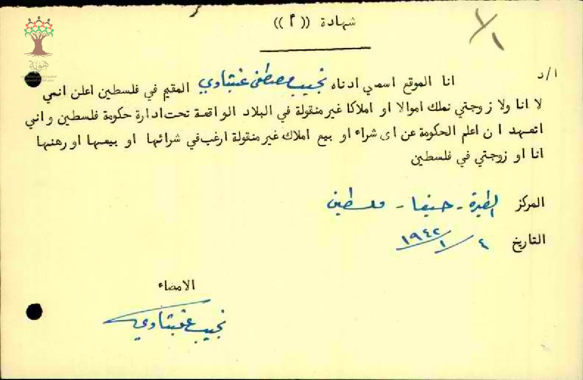 شهادة نفي ملكية انا الموقع نجيب مصطفى عنبتاوي المقيم في فلسطين اعلن اني لا انا ولا زوجتي نملك اموال او املاكا غير منقولة في البلاد الواقعة تحت ادارة حكومة فلسطين