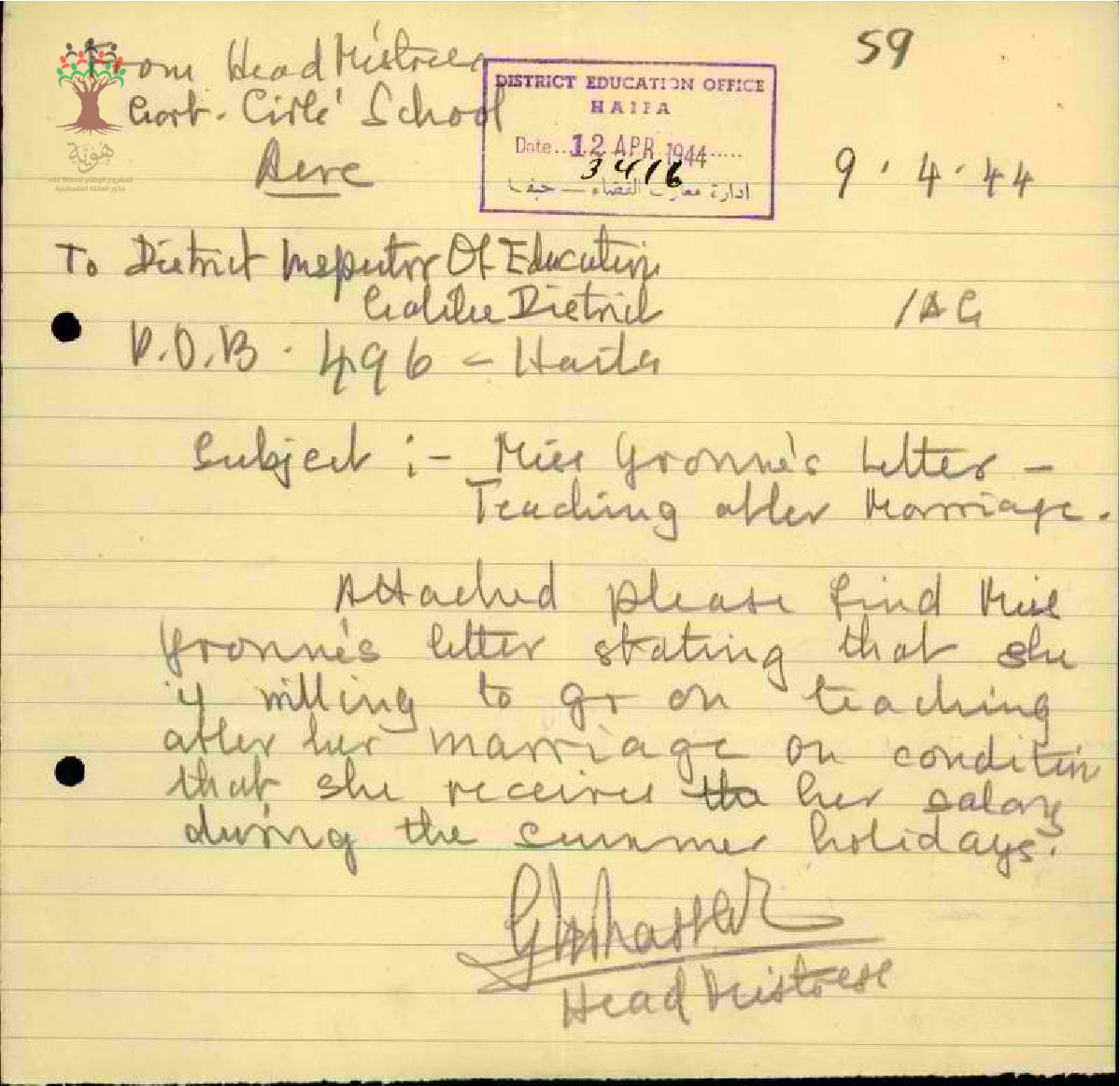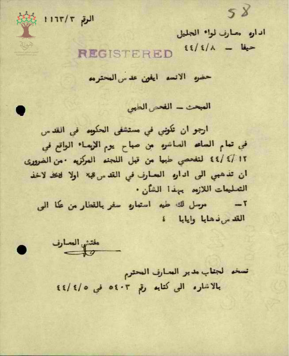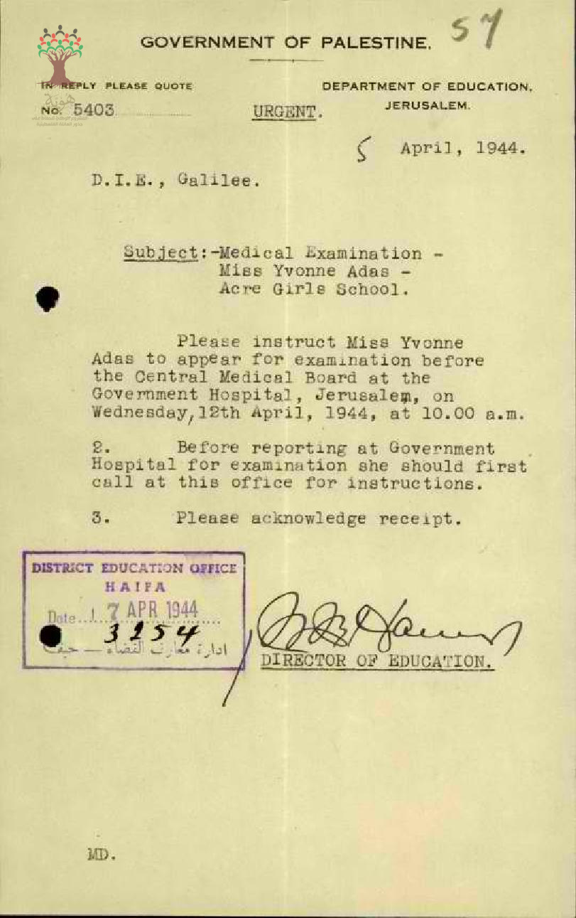 رسالة من مفتش المعارف إلى المعلمة ايفون عدس يطلب منها ضرورة التواجد في مستشفى الحكومة في القدس للفحص الطبي