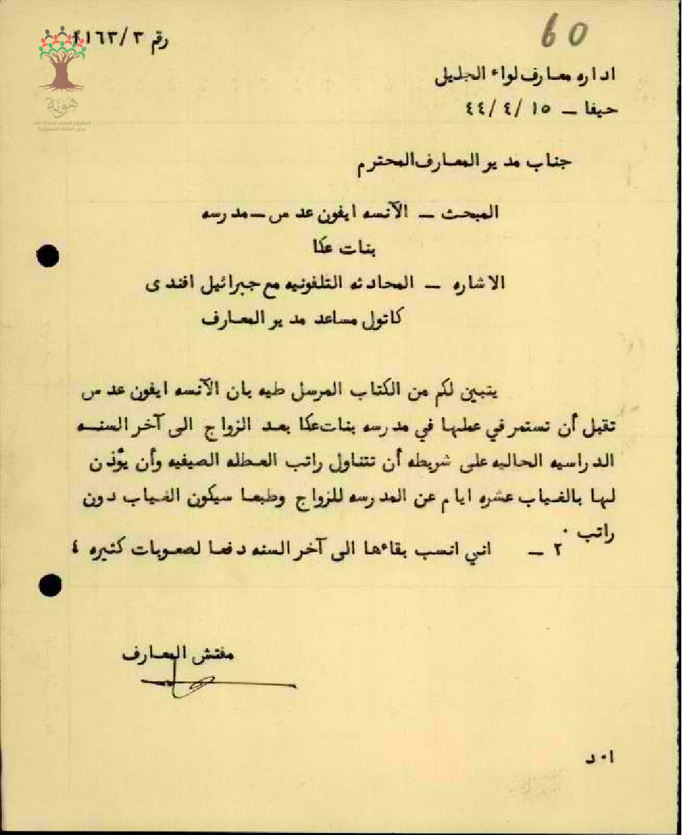 رسالة من مفتش المعارف إلى مدير المعارف يعلمه بقبول المعلمة ايفون عدس بالاستمرار في العمل في المدرسة حتى آخر السنة