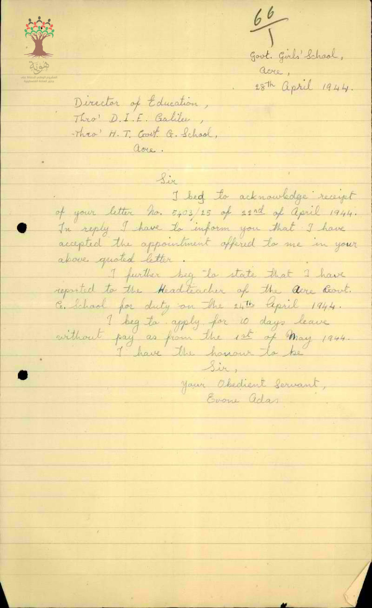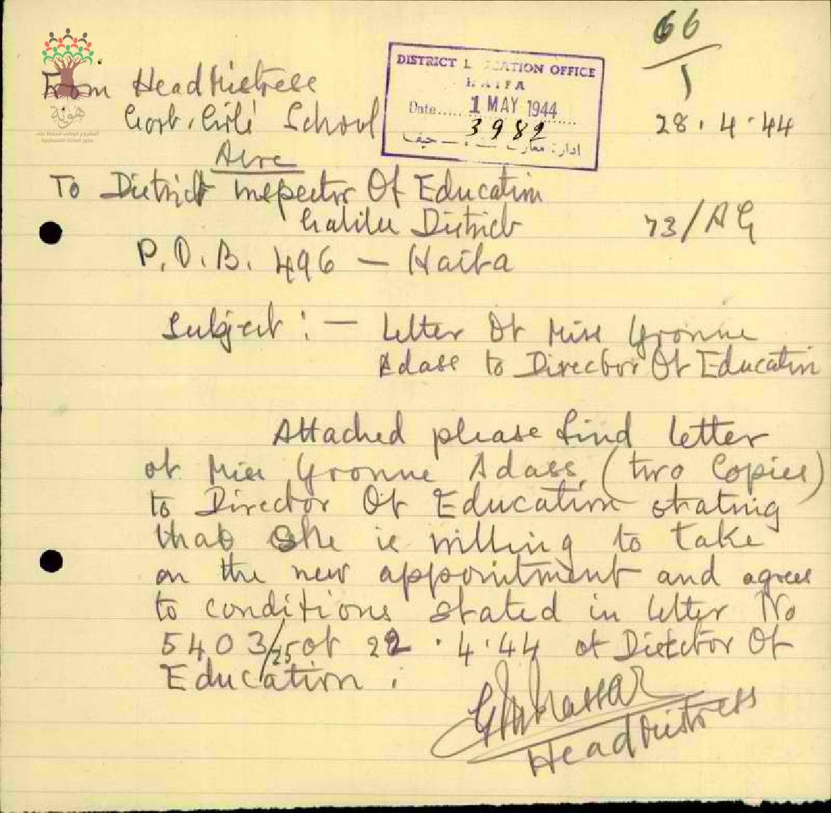 رسالة من المعلمة ايفون عدس إلى مدير المعارف تعلمه بقبولها التعيين في الإدارة