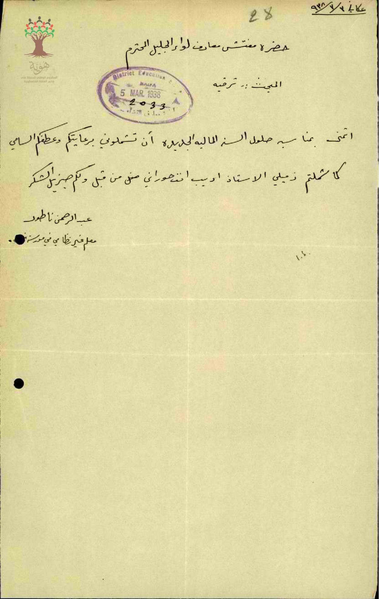 طلب ترقية مقدم من المعلم عبد الرحمن فرج الناطور اسوءة بالمعلم اديب حوراني