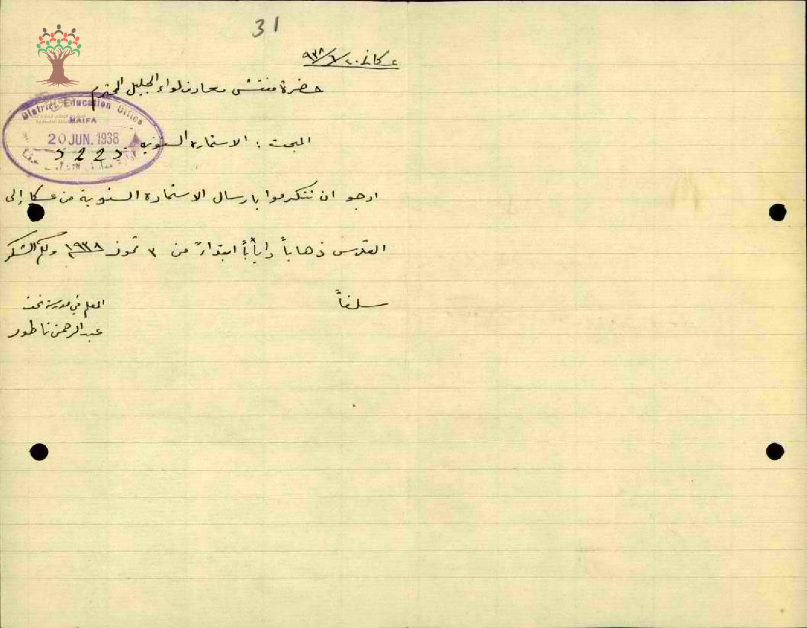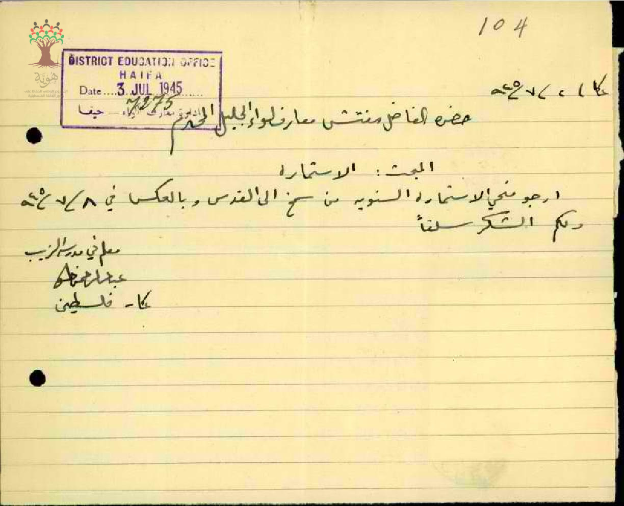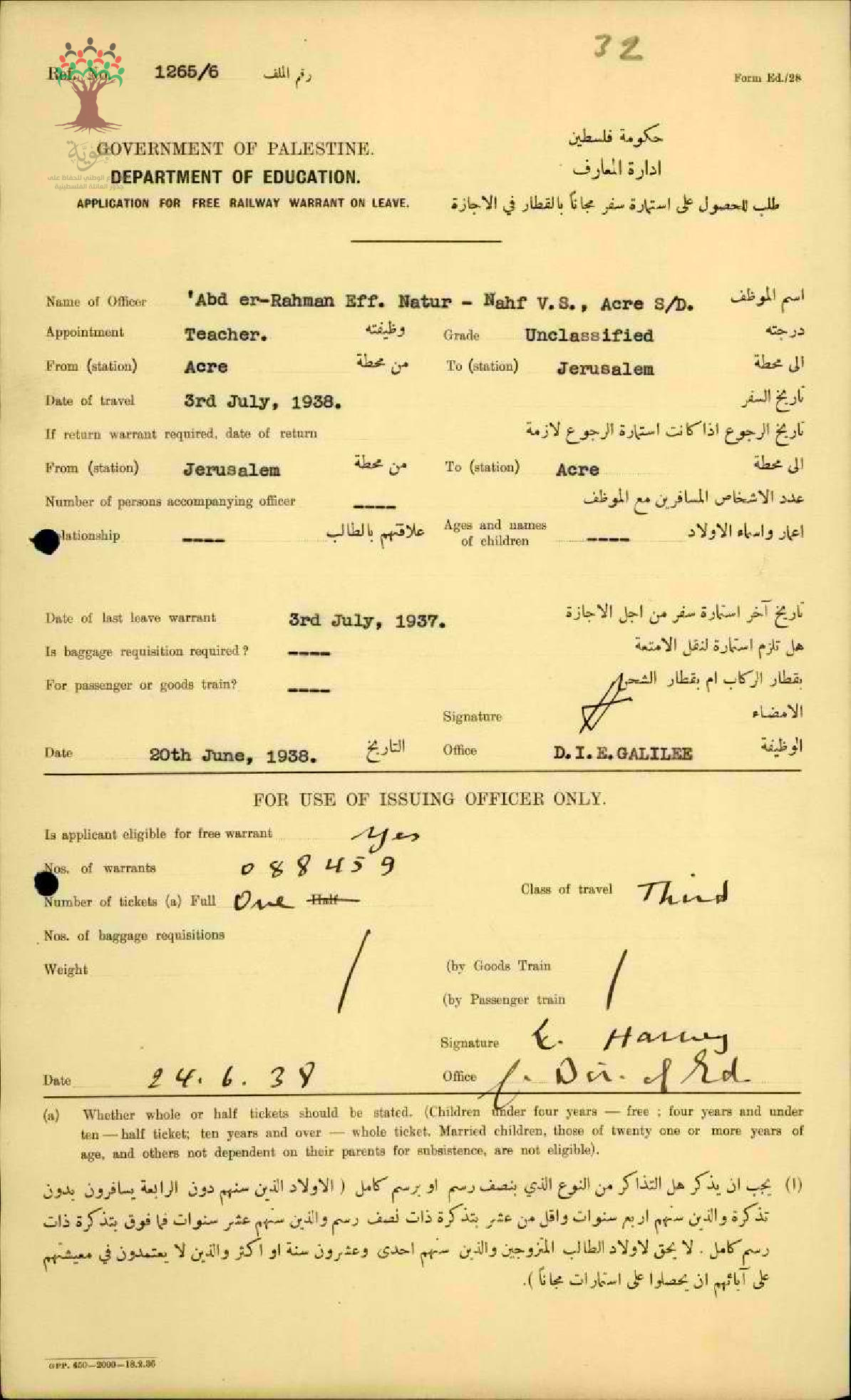 طلب ارسال استمارة السفر السنوية للقطار مقدم من المعلم عبد الرحمن فرج الناطور من مدرسة الزيب