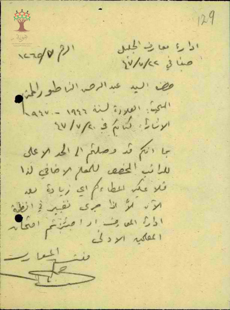 رد مفتش المعارف بأن طلب زيادة للراتب المقدم من المعلم عبد الرحمن فرج الناطور حيث انه وصل الى اعلى راتب ممكن ان يصل االيه المعلم في الدرجات الغير نظامية
