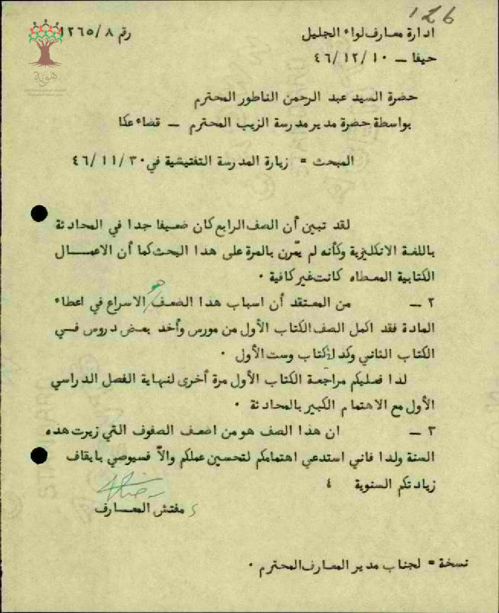 رسالة مفتش المعارف بخصوص الزيارة التفتيشية لمدرسة الزيب