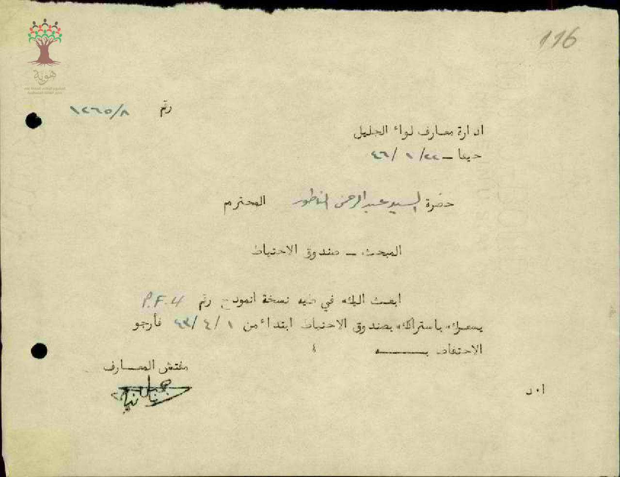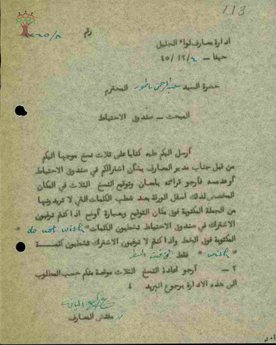 ارسال نموذج من صندوق الاحتياط للمعلم عبد الرحمن فرج الناطور من قبل مفتش المعارف يطلب منه الاحتفاظ بالنسخة المرسلة