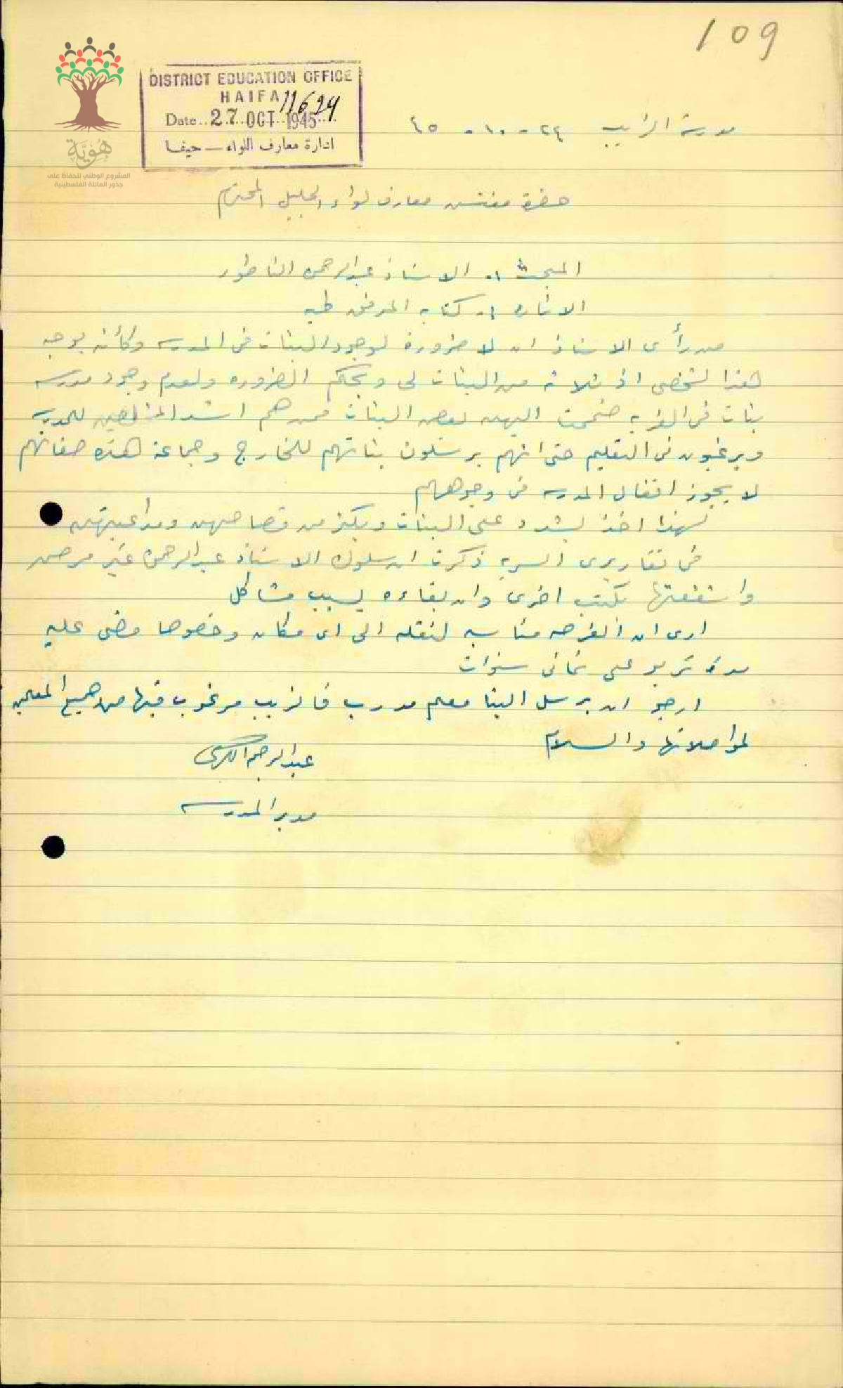 طلب نقل المعلم عبد الرحمن فرج الناطور مقدم من مدير مدرسة الزيب بسبب تجوازاته لانظمة المدرسة