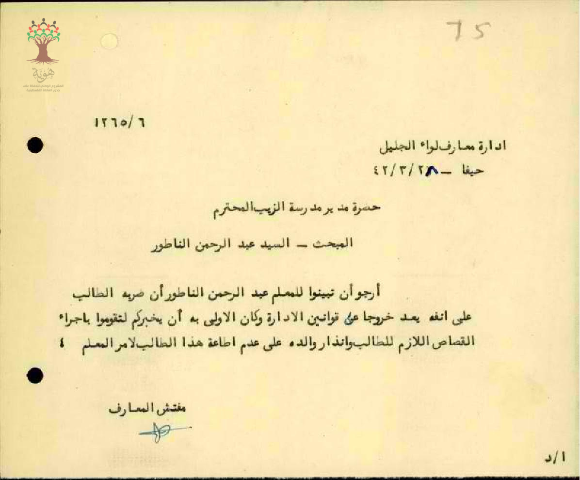 رسالة تنبيه للمعلم عبد الرحمن فرج الناطور لجهة تعرضه بالضرب لأحد الطلاب