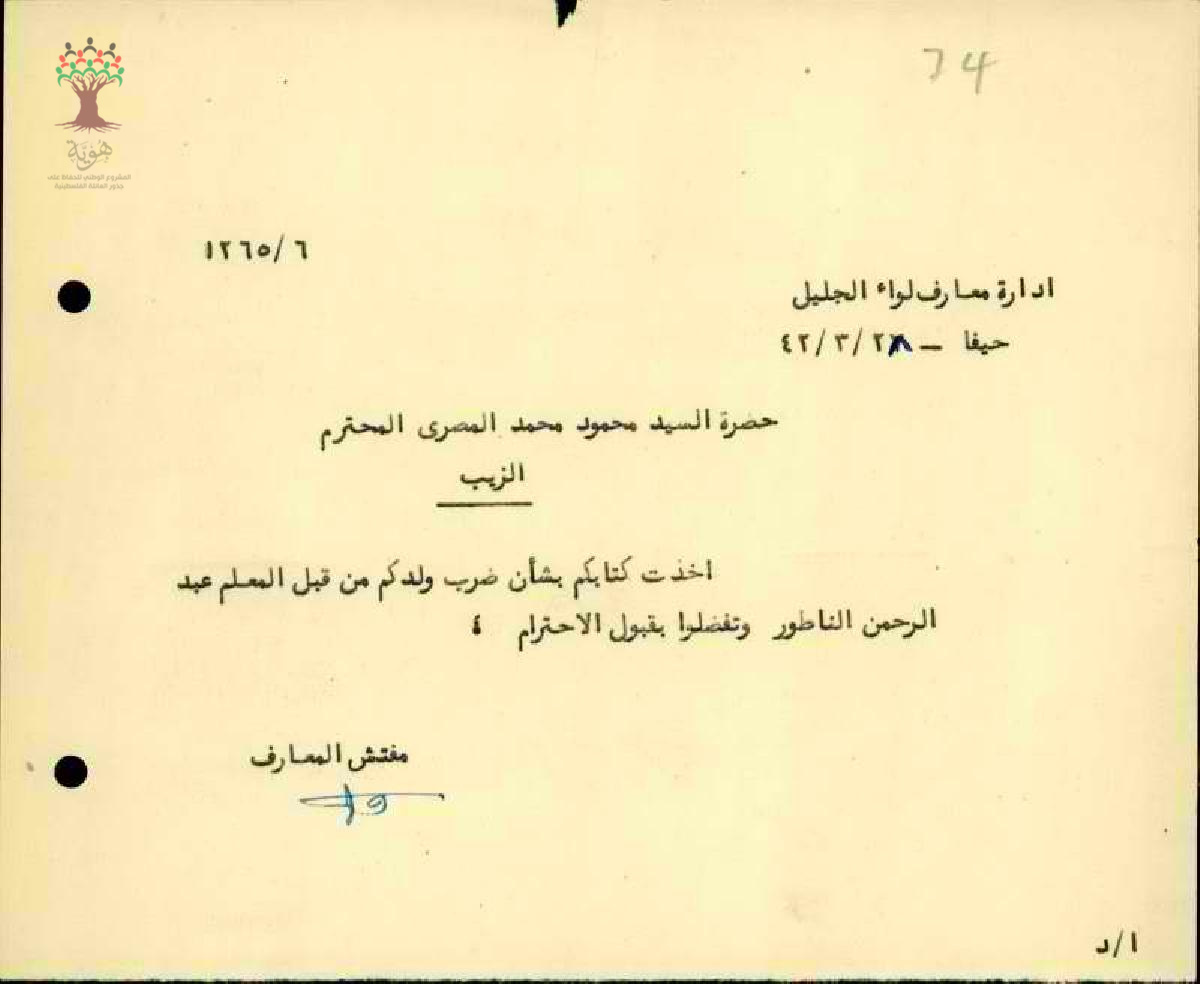 رد مفتش المعارف بخصوص شكوى والد الطلاب بعد تعرضه للضرب من قبل المعلم عبد الرحمن فرج الناطور