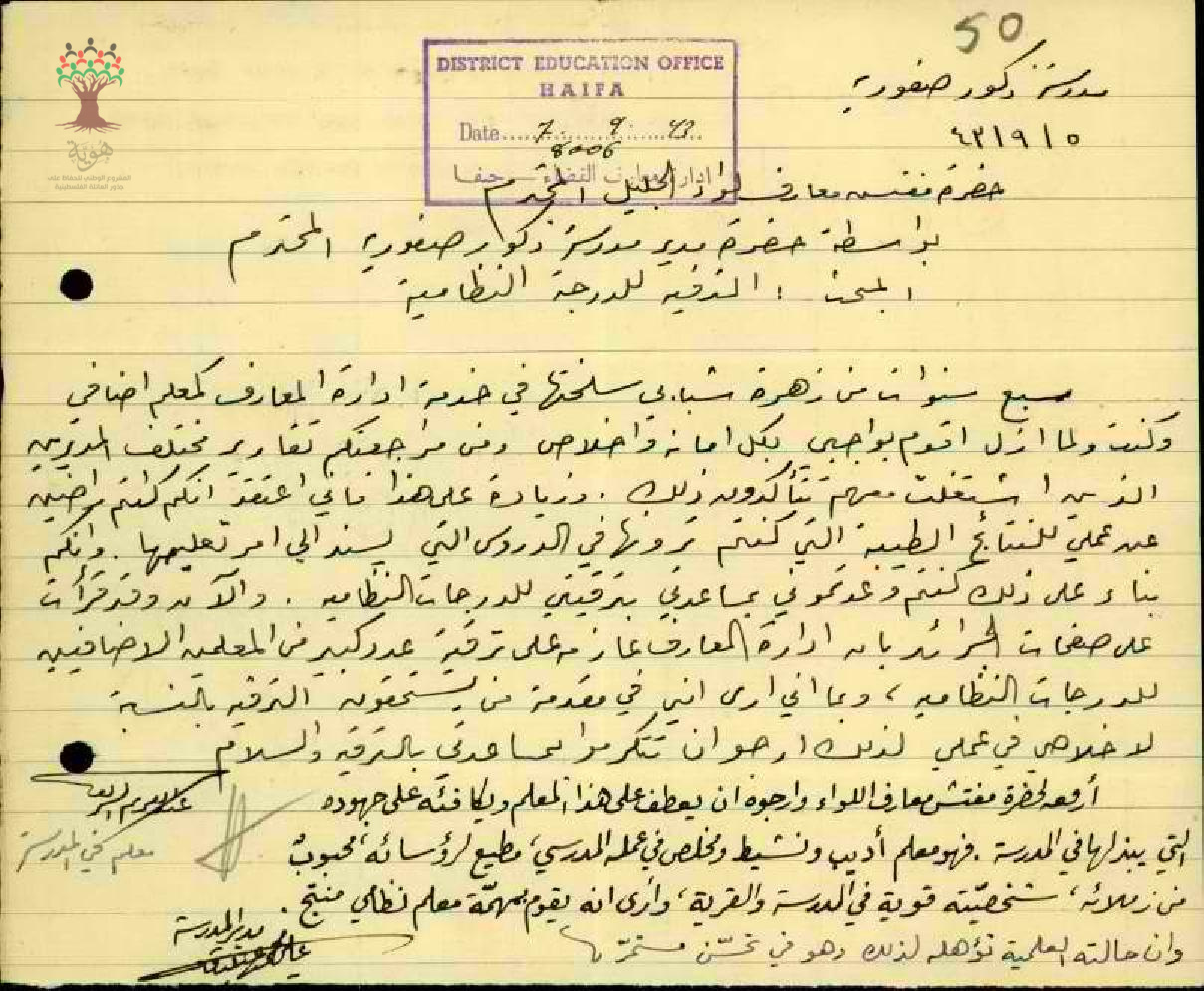رسالة من المعلم عبد الكريم محمد الشريف الى مفتش معارف الجليل سبع سنوات من زهرة شبابي سلختها في خدمة ادارة المعارف كمعلم اضافي وكنت ولما ازل اقوم بواجبي بكل امان واخلاص