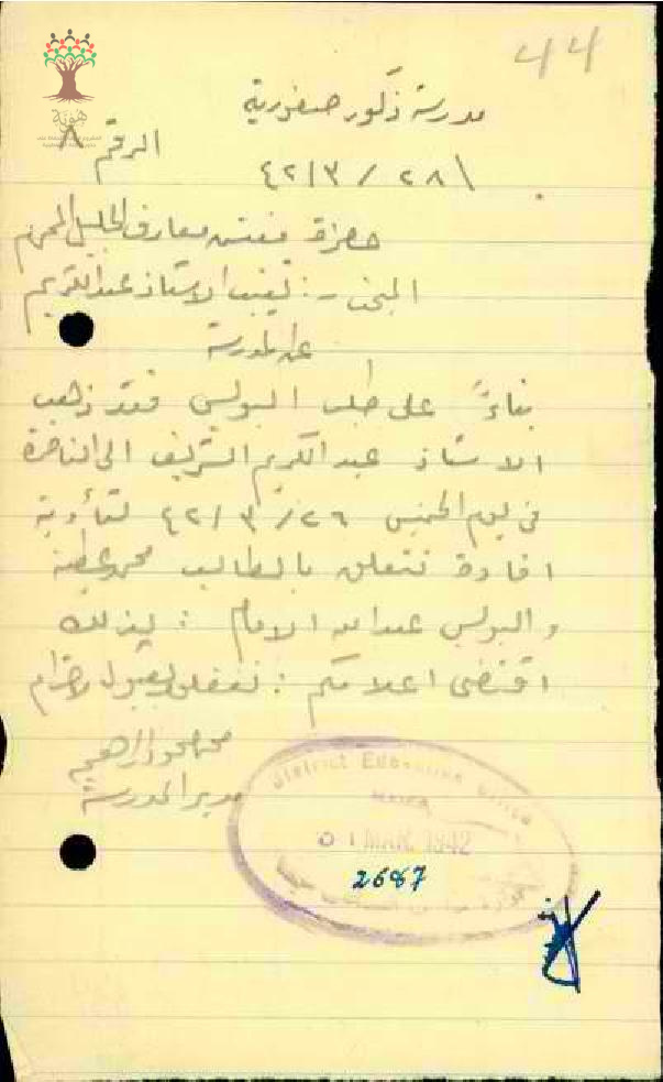 رسالة من مدير المدرسة الى مفتش المعارف تغيب المعلم عبد الكريم محمد الشريف بناء على طلب البوليس فقد ذهب المعلم عبد الكريم الشريف الى الناصرة في يوم الخميس