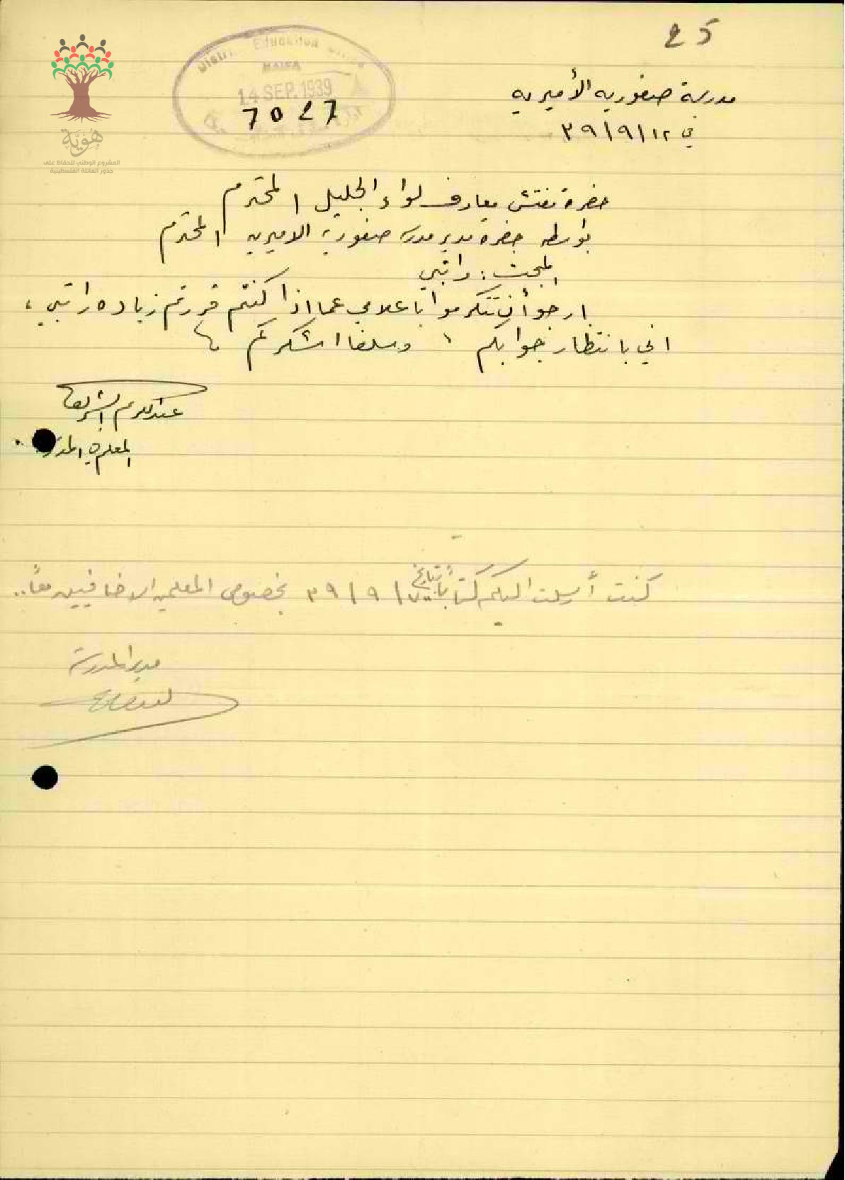 رسالة من المعلم عبد الكريم الى مفتش معارف الجليل ارجو ان تتكرموا باعلامي عما اذ كنتم قررتم زيادة راتبي