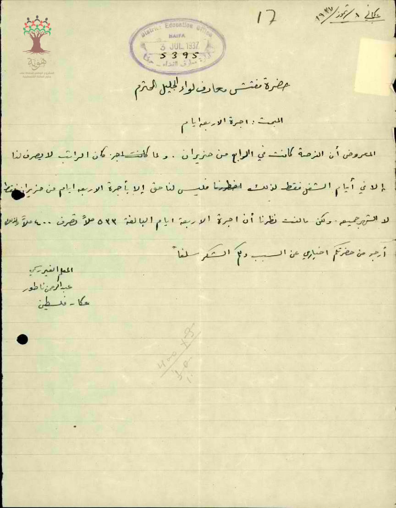 استفسار عن راتب اربعة ايام اضافية مقدم من المعلم عبد الرحمن فرج الناطور