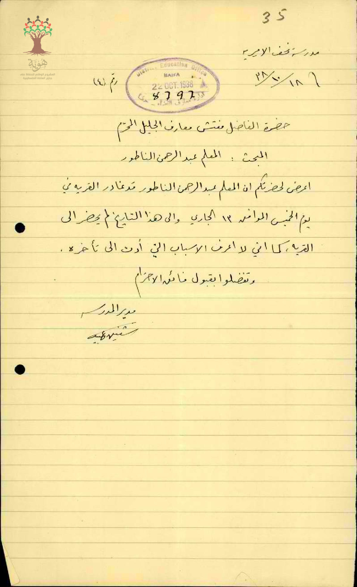 تقرير عن غياب المعلم عبد الرحمن فرج الناطور عن القرية